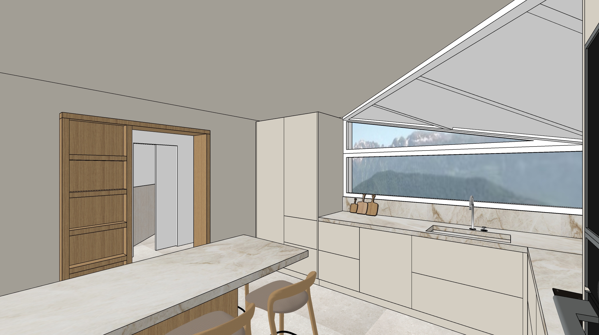 cuisine avec fa ades lisses et non brillantes de couleur beige clair plan de travail en quartzite perla venata sol en travertin paysage montagne