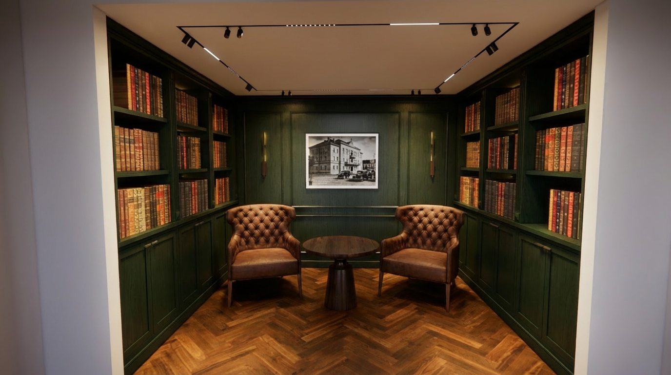 a realistic podcast studio keeping the original colors and overall layout unchanged the space features a warm and inviting atmosphere illuminated by soft warm light coming from a library bookshelf in the background two people are sitting and talking naturally with professional podcast microphones placed in front of them the lighting creates a cozy intimate mood with natural shadows and realistic textures high detail photorealistic style