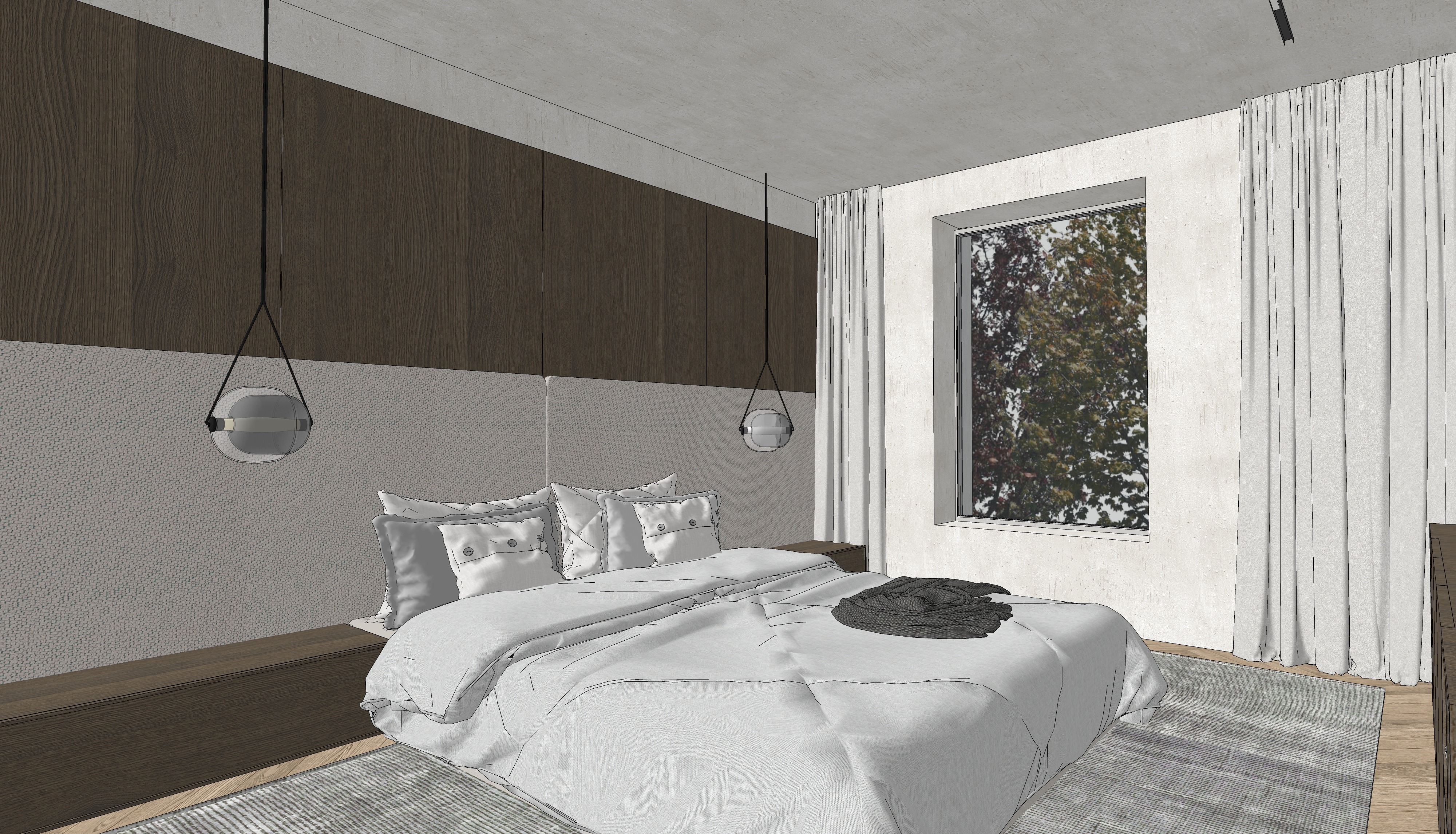 make render of bedroom preserve wood on furniture make wood herringbone floor light beige plaster of microcement add spotlights on ceiling small recessed fabric on bedhead light beige cotton texture bed linen light beige silk