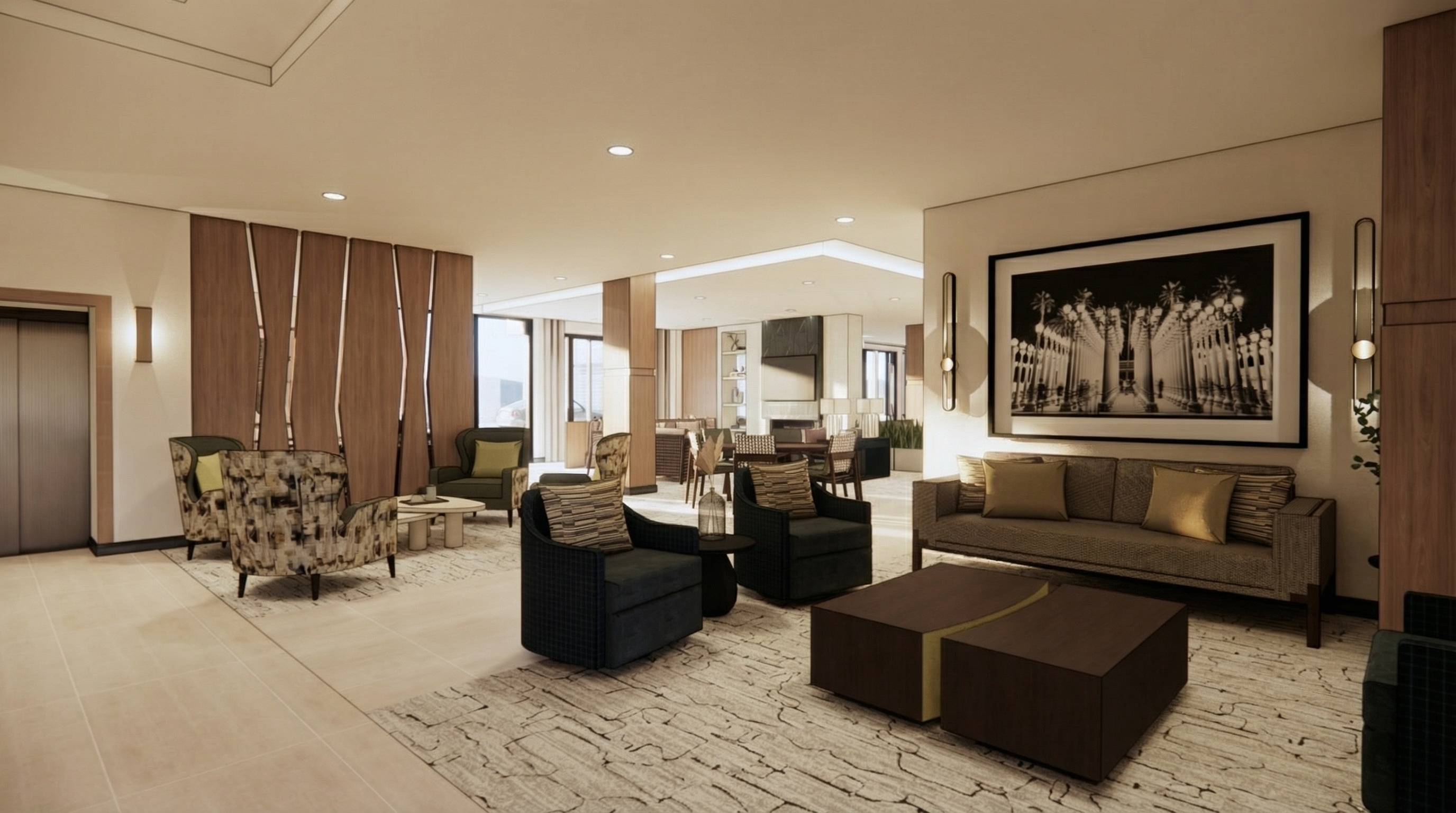 remove bottom window hand side use same color tone to render this one lighter interior space long linear wood panel floor same as previous rendering litter wood floor interior space lighter add a chandelier light above dining table tall ceiling lower the light add 3 pendant light top of the island bigger pendant light