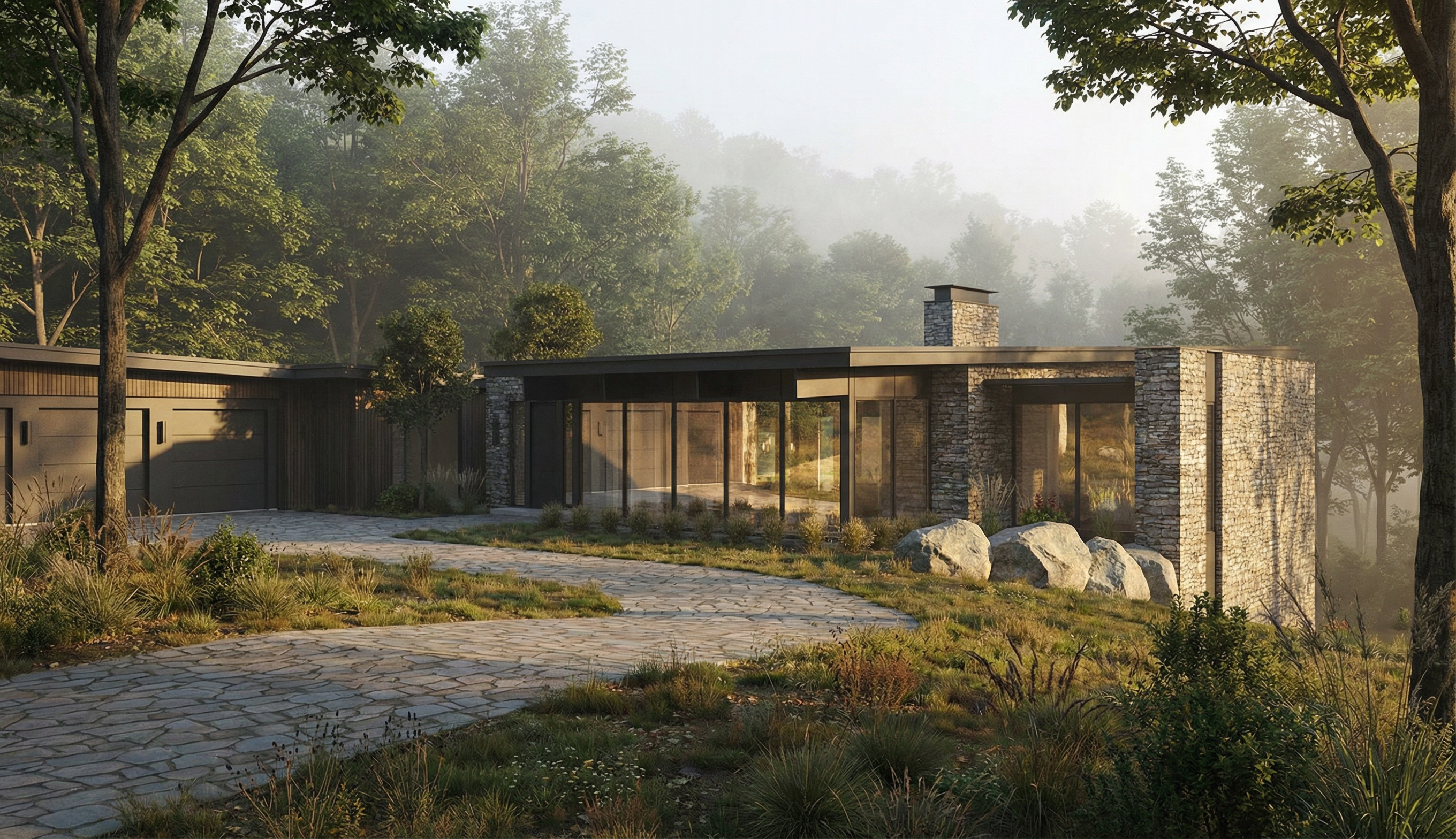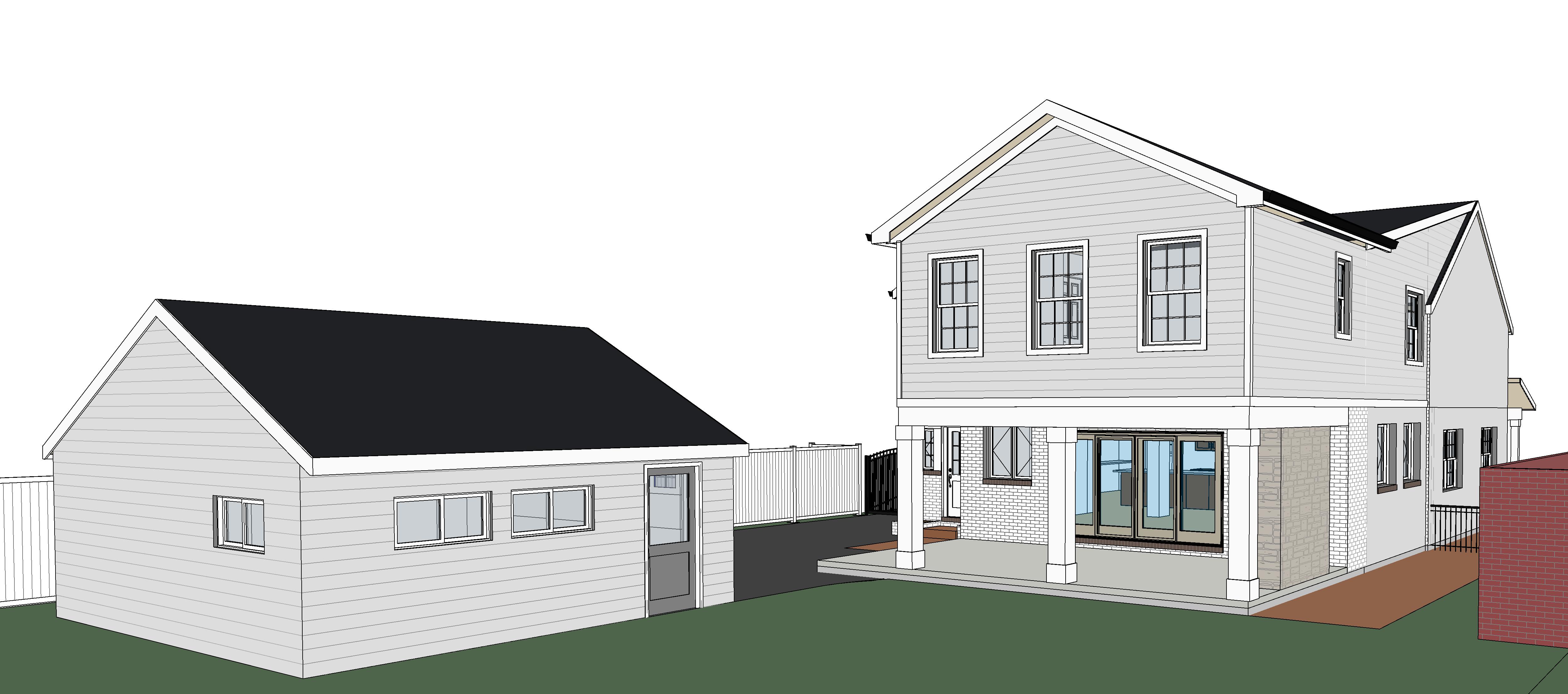 strict maintain exact building geometry proportions rooflines openings and camera perspective from the input photo reference use the revit model to guide the new addition massing and layout project rear addition to an existing 2 story home with upper level bedroom addition covered outdoor living space below new integrated outdoor stone fireplace critical rules do not alter existing house design window sizes door locations or roof forms do not redesign architecture only enhance realism and apply materials keep all proportions and structure exactly as modeled fireplace must fit naturally within the covered space not oversized or forced design intent create a seamless high end addition that feels original to the home covered patio acts as a true outdoor living room fireplace becomes the focal point of the space overall look clean timeless slightly traditional fireplace design key feature material natural stone veneer warm gray light taupe tones scale proportional to seating area not massive style rectangular firebox opening minimal or no mantel clean look full height or near full height to ceiling for presence chimney simple integrated into wall plane or centered element detailing tight joints refined edges no rustic heavy look materials match existing exactly horizontal lap siding light warm white off white painted brick base white black dark charcoal roof white trim dark window frames architectural enhancements realistic only clean square columns posts supporting covered structure subtle beam depth for shadow fireplace integrated along back or side wall of patio slight ceiling detail flat or light tongue and groove feel but subtle outdoor living layout centered around fireplace arrange furniture to face the fireplace neutral tone sectional 1 2 lounge chairs low coffee table keep layout clean and conversational no clutter site patio upgrade patio to clean high end pavers keep landscaping minimal low grasses simple foundation planting maintain open views to architecture lighting atmosphere natural daylight soft afternoon light preferred soft shadows under covered area subtle warm glow from fireplace very important for realism slight warm interior glow through house windows rendering style photorealistic high end residential marketing image clean sharp no distortion balanced exposure emphasis on material realism stone siding especially keywords outdoor fireplace covered patio seamless addition modern traditional natural stone veneer warm residential outdoor living realistic lighting clean detailing