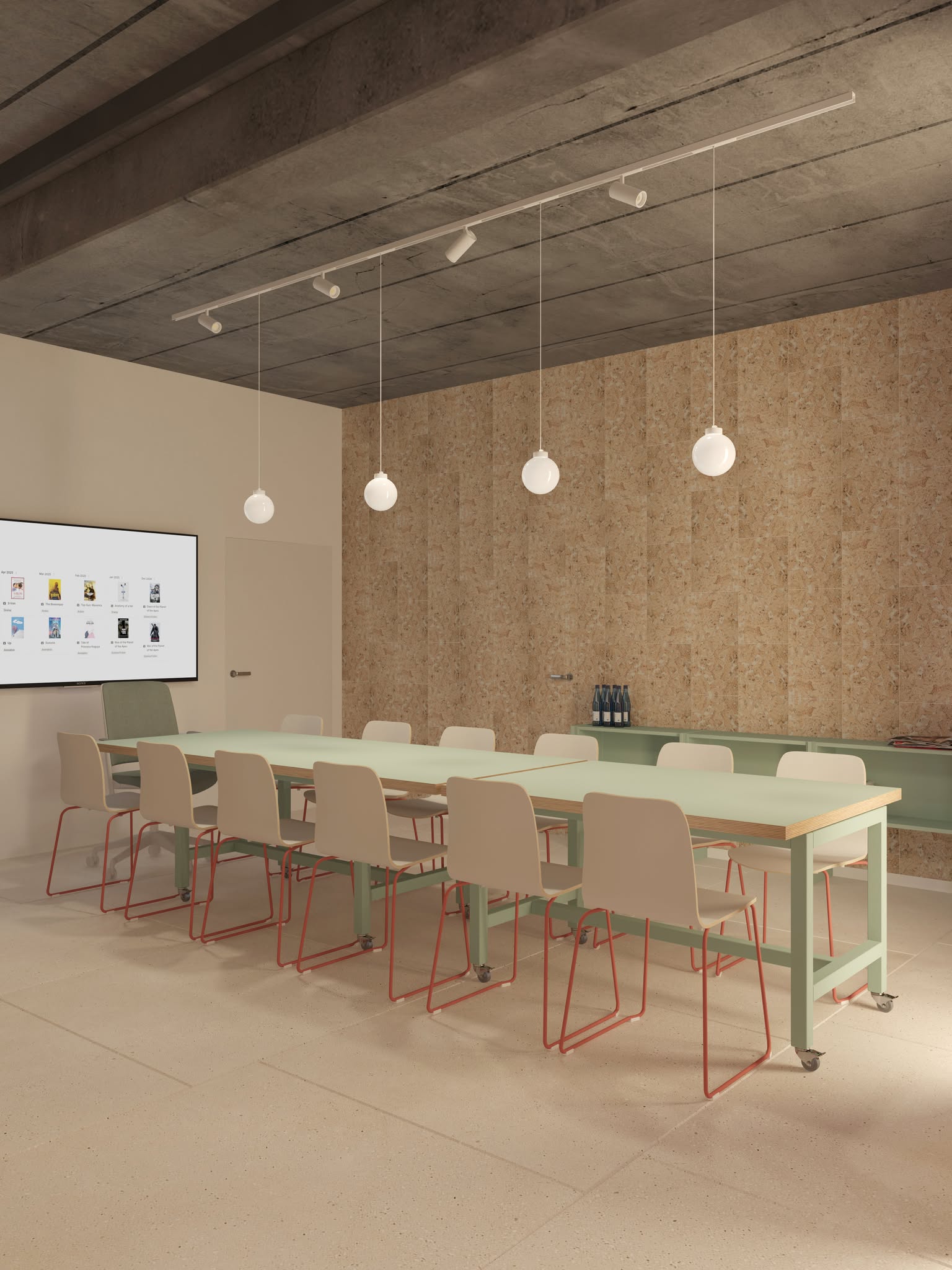 make this render better more accurate materials and soft artificial lighting from the ceiling wall in front of the camera is made of cork slabs