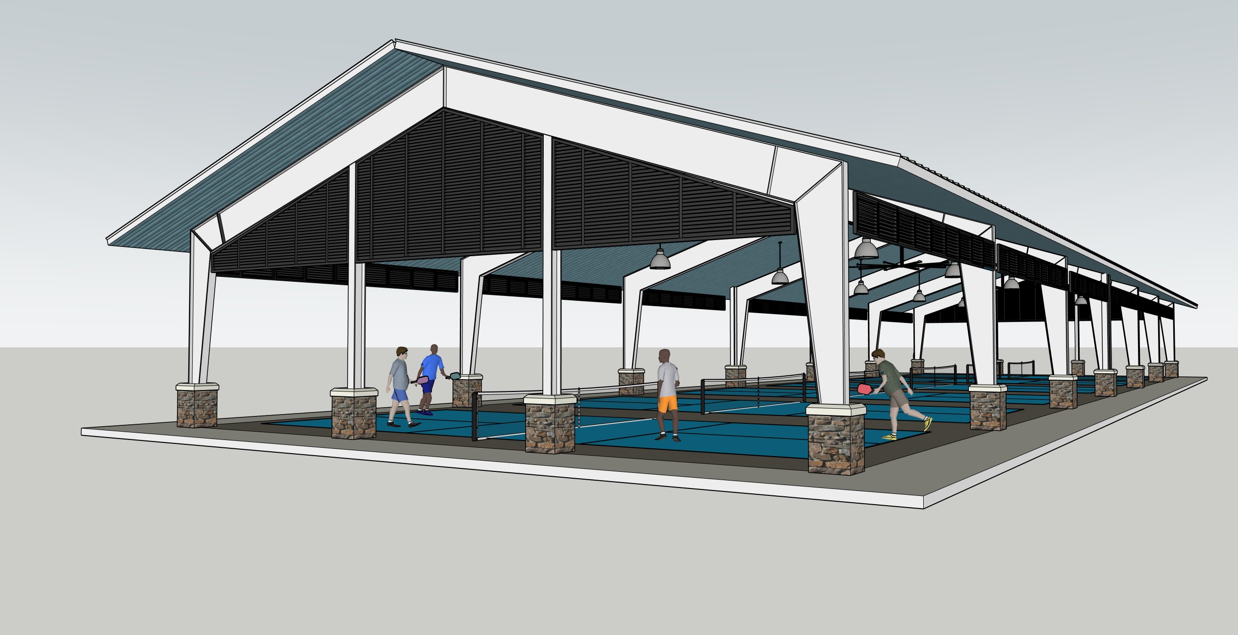florida location middle of the day modern looking clean lines pickleball players on the courts sport bags on the ground tennis courts in background sidewalks and grass surrounding