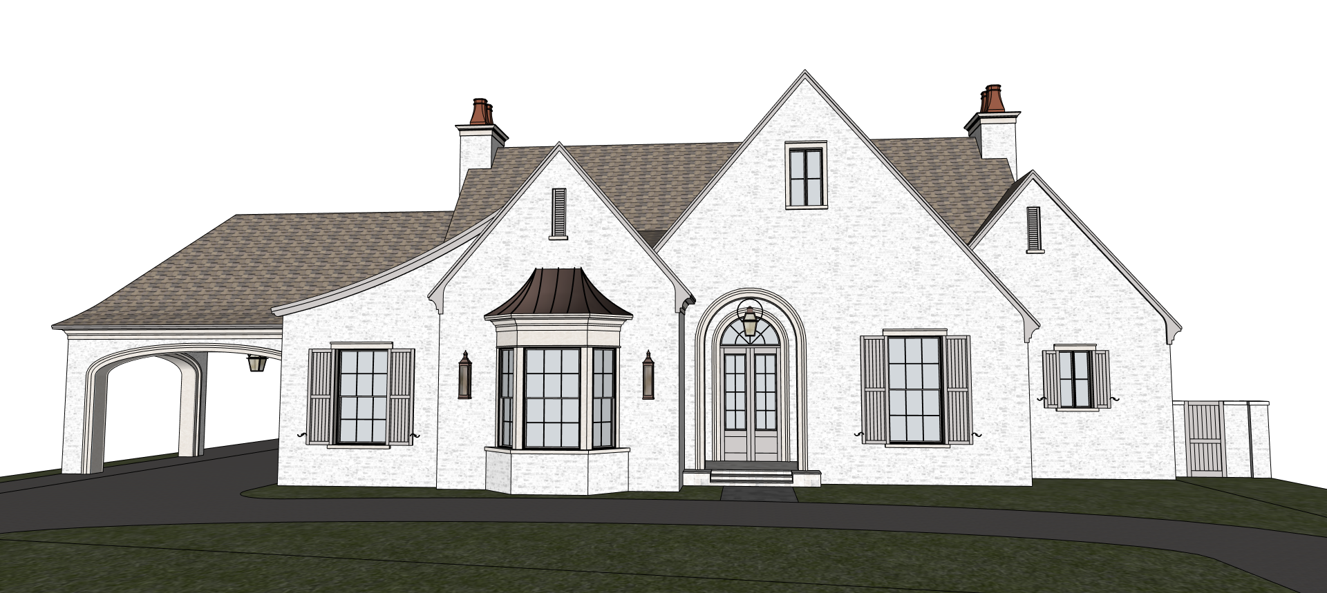 white brick walls with light taupe trim and shutters add low plants to front of house