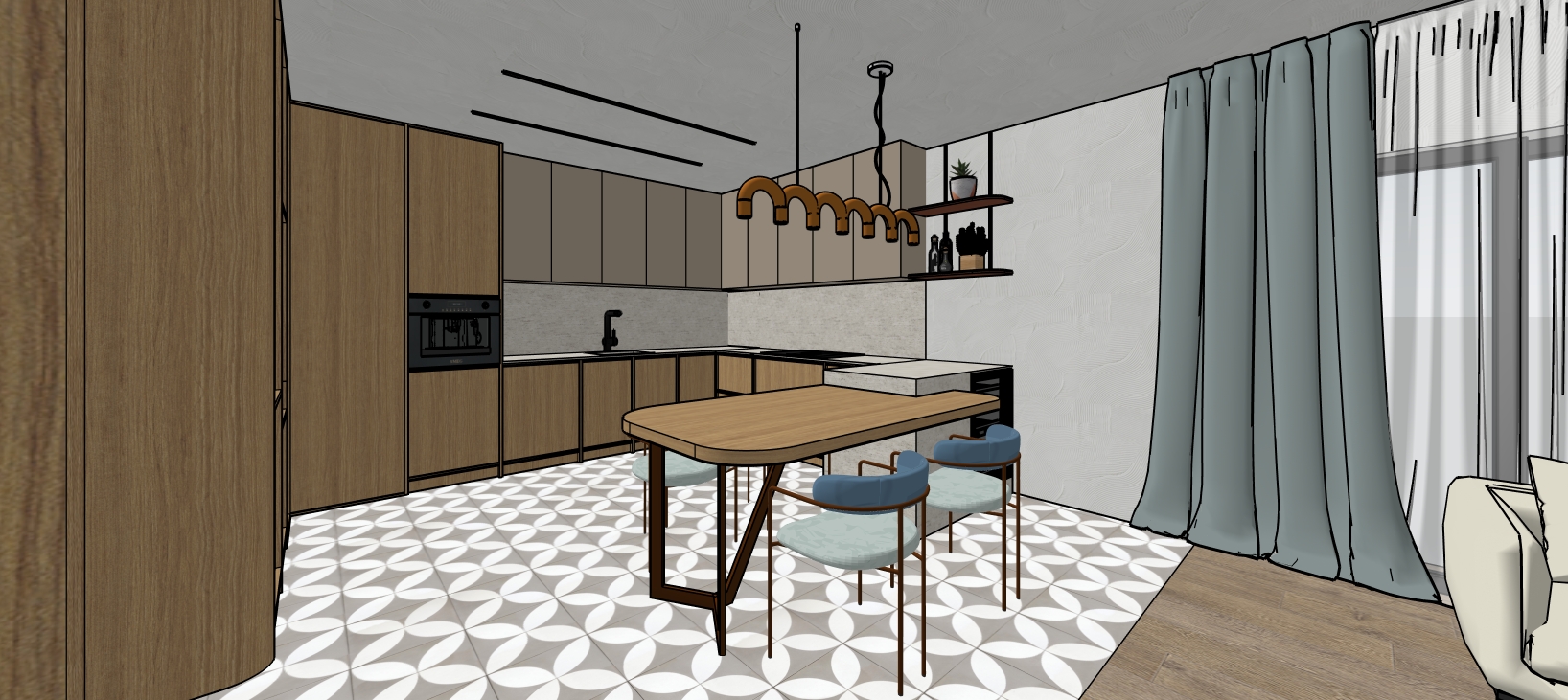 interior photography of a modern minimalist open plan kitchen and dining area key elements to include a u shaped natural oak wood cabinetry unit with integrated dark glass appliances on the left a central island unit topped with textured light beige travertine stone which seamlessly merges into a light wood dining cantilevered table four matching blue upholstered metal frame chairs around the table a high end glass door wine cooler embedded in the stone island materials and lighting the floor must have the exact geometric mosaic tile pattern the wall behind the kitchen counter must be the textured travertine stone hanging above the island is the terracotta multi arched sculptural pendant light including its unique squiggly and fine straight suspension cables warm led strip lighting under the upper beige cabinets beige curtain draped on the far right composition and mood one point perspective wide angle lens clean and precise lines soft diffused daylight from a window on the right warm cozy midday atmosphere from the pendant and strip lights photorealistic 8k highly detailed architectural visualization s a light teal greetyle