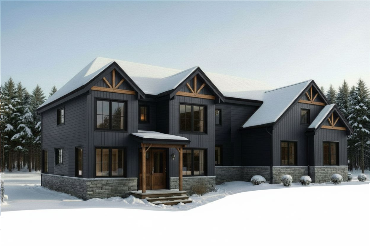 dark blue siding black window trim flat stacked stone veneer only below the windows leave all siding directions as is white band above stone veneer to be dark do not add anything additional
