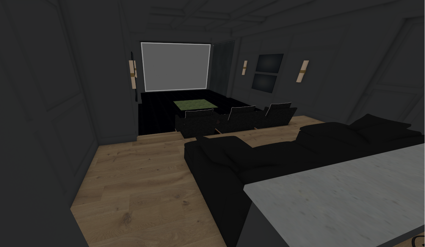 bright moody lighting this is a golf simulator room add a golfer in the middle square and golf course on projector screen