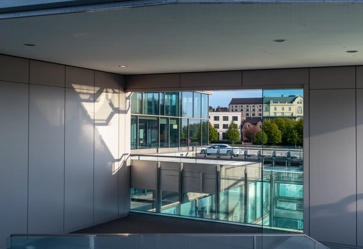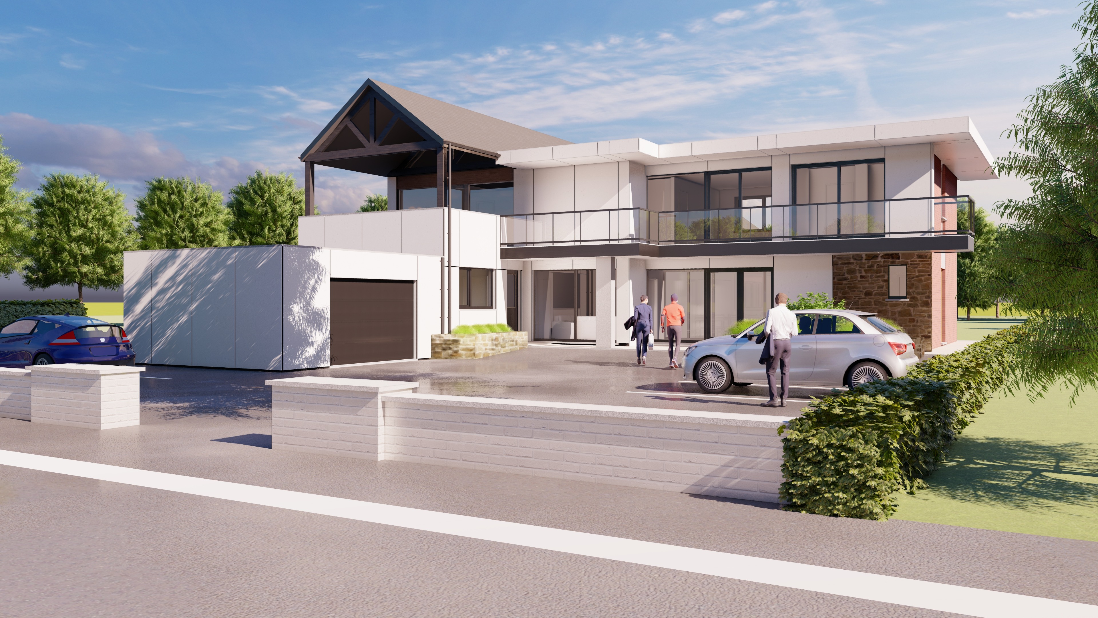 create a high quality photorealistic architectural rendering based on the provided reference image maintain the same material palette textures and color scheme as shown in the reference the architectural volumes proportions and overall design intent must remain faithful to the original image include vegetation similar to the reference image subtly enhanced to appear more natural lush and realistic while remaining secondary to the architecture add a limited number of human figures and vehicles consistent with those visible in the reference image to convey scale and everyday use characters and vehicles should be realistic well integrated and unobtrusive supporting the architectural reading rather than drawing attention focus on realistic lighting accurate material behavior and a clean contemporary architectural visualization style suitable for a professional architecture office presentation