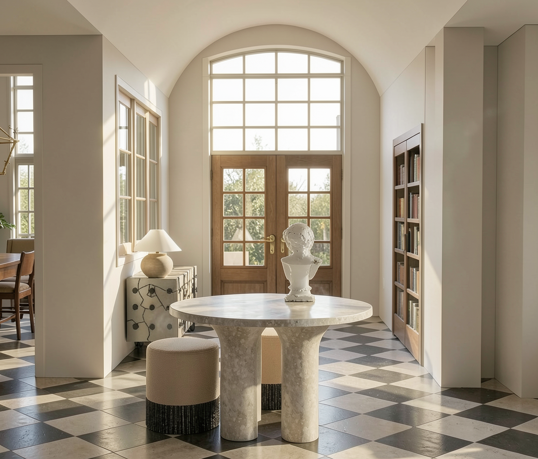 keep everything as is change the right side bookshelves to be white french doors with glass keep the center doors under the window in wood as shown