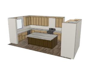 remove the sink at the top of the wall on the right hand side of the kitchen area change the wood color of the cabinets to a dark red cherry wood color