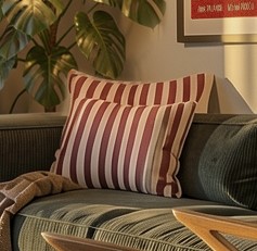 close up photograph of a green upholstered sofa with a red and white striped cushion keep the entire image exactly the same in composition lighting colors shadows and textures do not modify anything except the cushion fix the cushion so it becomes one single complete well defined cushion not appearing duplicated cut or fragmented correct any inconsistencies in shape so the volume is coherent and continuous ensure the fabric looks uniform and natural with a consistent surface and no distortions the red and white stripes must be perfectly continuous aligned and evenly spaced across the entire cushion without breaks shifts or mismatches maintain a realistic soft folded appearance with natural creases that follow the structure of a single cushion photorealistic result seamless correction no artifacts no changes to any other part of the image