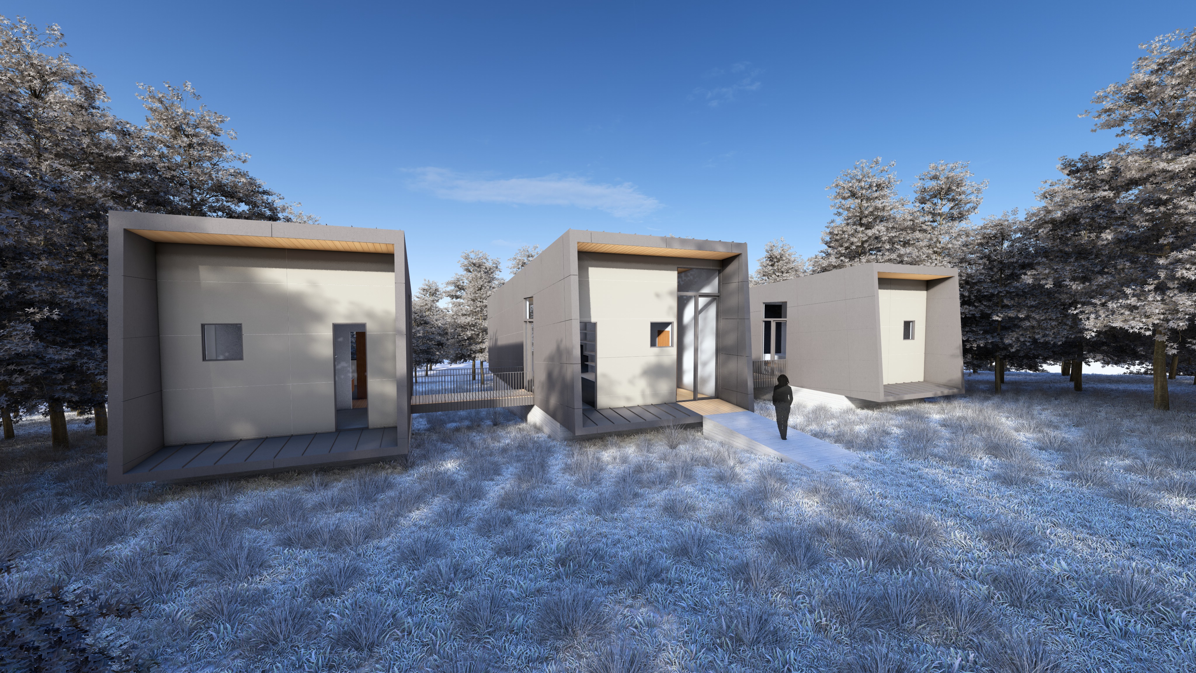 render a photorealistic 3d perspective of this house in a truckee ca reference the current material style just enhance them medium gray fiber cement siding board form cement foundation and chimney medium tone tongue and groove ceiling keep model geometry the same windows doors roof walls make a lush vegetation that looks native to truckee ca do not change the view only enhance the current materials and make the landscape nicer vegetation detailed textures in the wood siding and glass reflections and a vibrant clear sky with light atmospheric depth render in hyper realistic architectural visualization quality 8k resolution