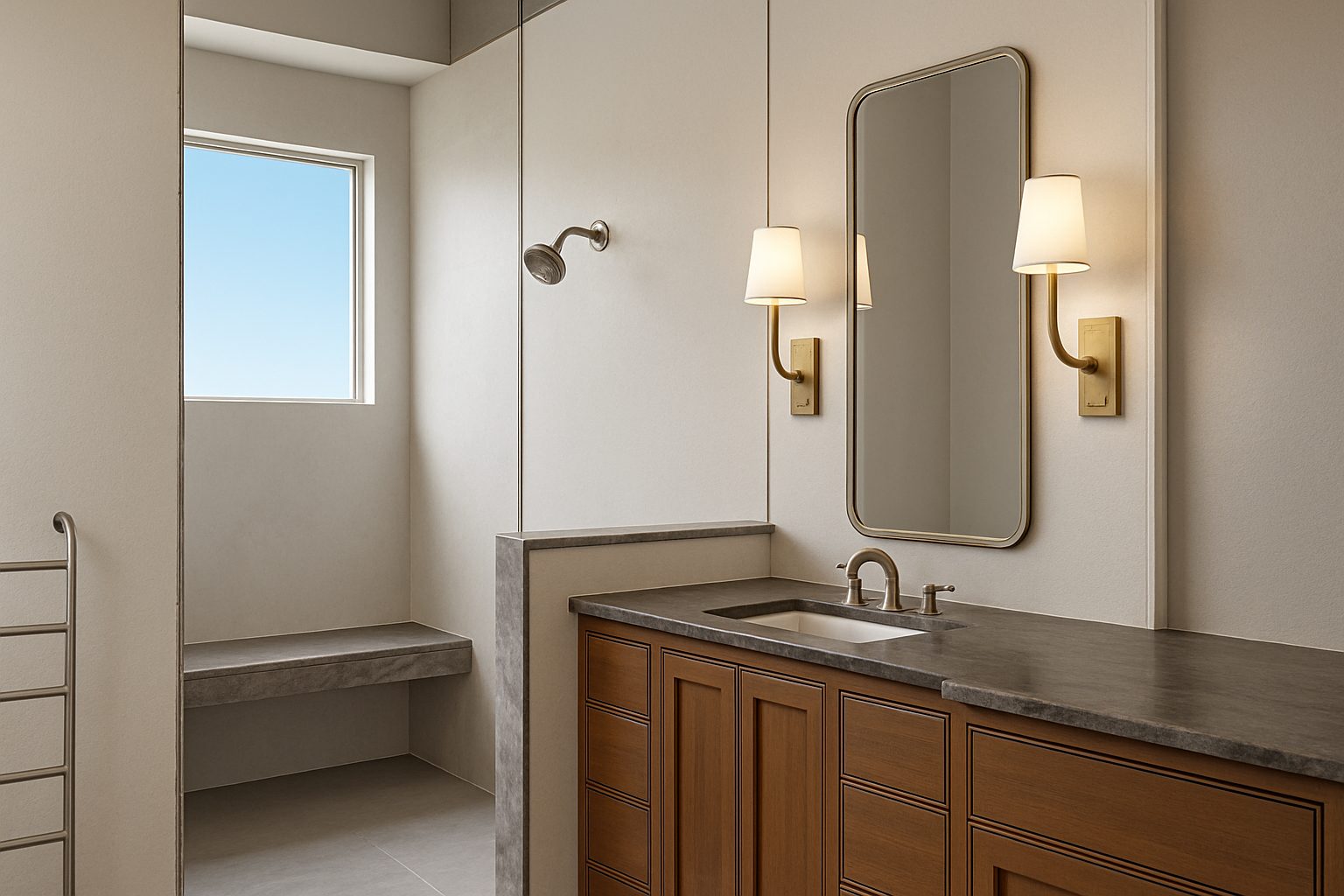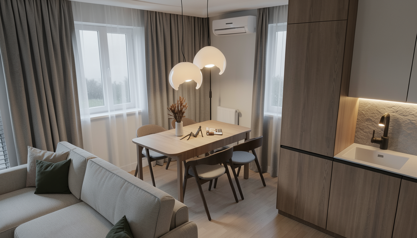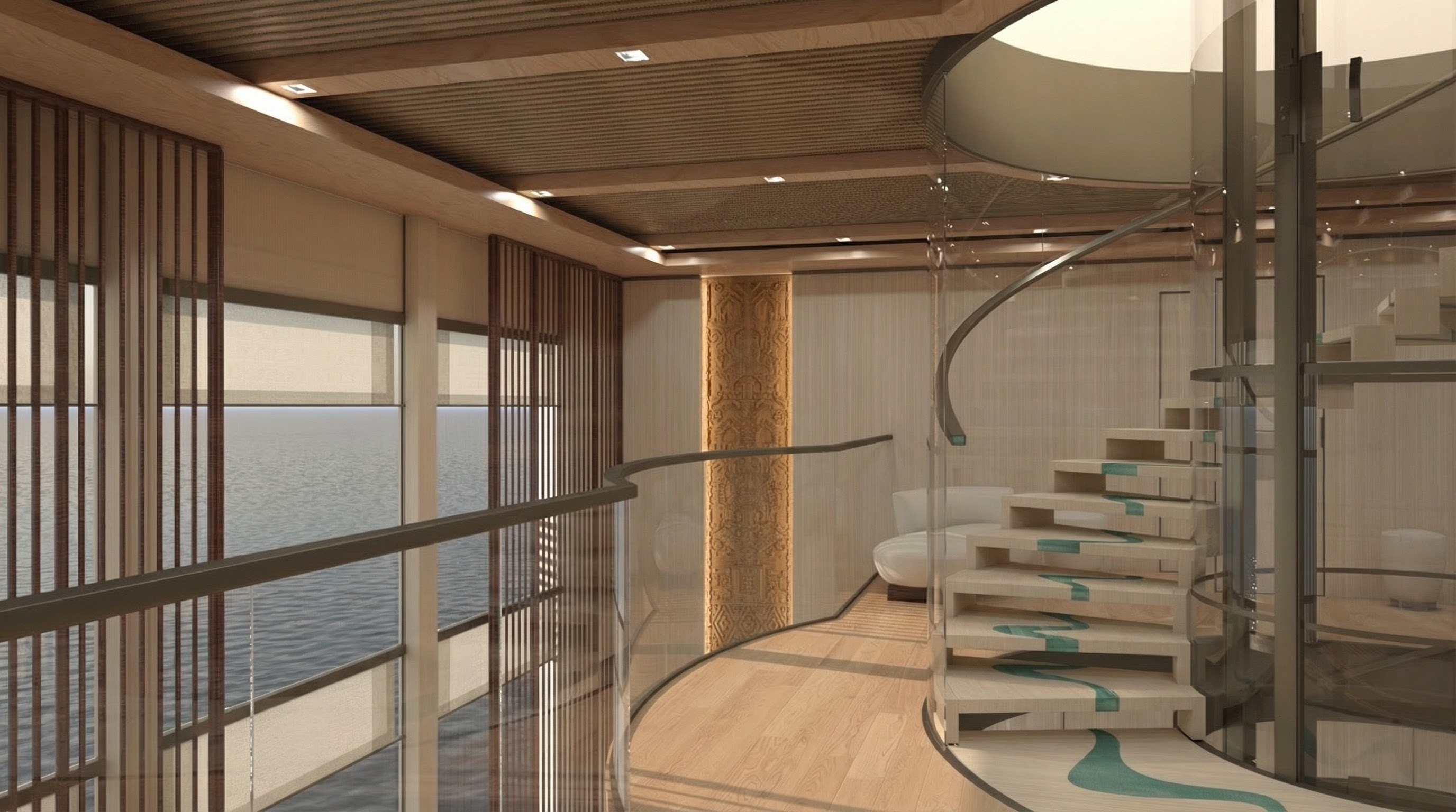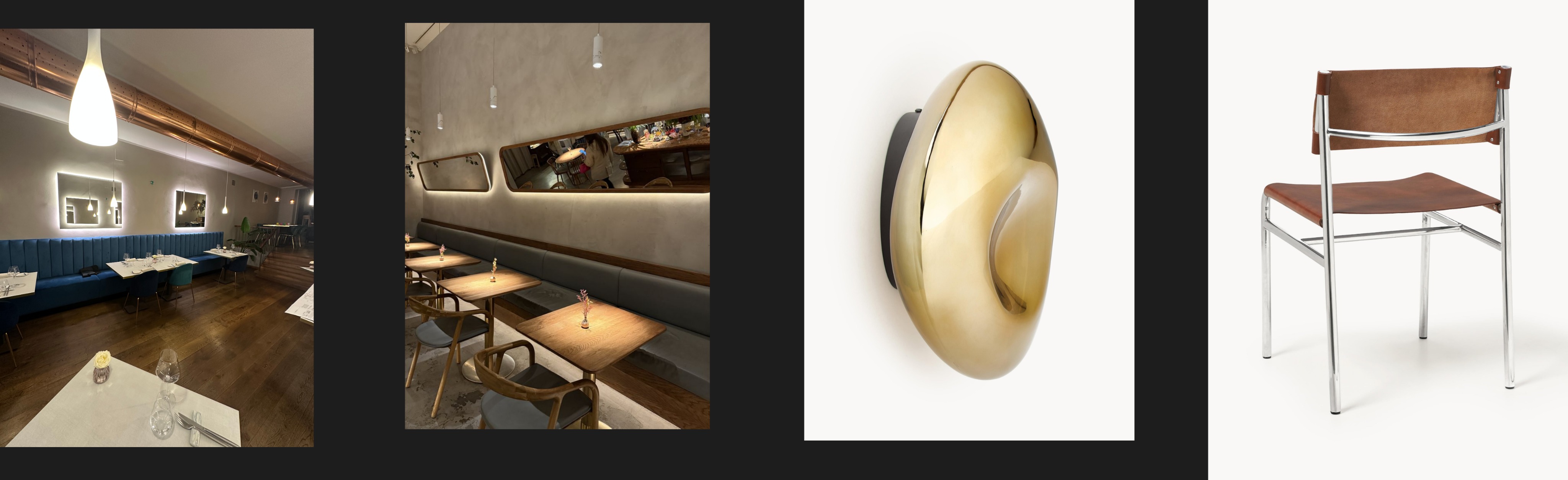 modernist interior shot use the first reference image strictly as spatial and camera reference maintain exactly the same room proportions layout depth scale ceiling height stairs railings and camera position do not alter the architecture in any way do not widen or heighten the space do not introduce new openings or structural elements maintain the existing long continuous blue banquette sofa running along the wall exactly as in the reference image do not change its length position height color or upholstery do not replace it with chairs or separate seating the banquette must remain continuous and integrated along the wall maintain all dining tables exactly in the same position as shown in the reference image do not change the table layout spacing alignment or quantity the number of tables and the number of seats must remain identical maintain the exact same floor as in the reference image same material color texture finish and level of reflectivity preserve all natural reflections and light response on the floor maintain the existing exposed metal duct running along the ceiling exactly as shown in the reference image same position size material and finish do not remove it replace it or redesign it use the second reference image only for wall surface treatment mirrors and ceiling pendant light model walls must be finished in continuous warm plaster with a soft tactile texture and subtle tonal variations no paneling no boiserie no decorative frames along the mirror wall place exactly three inclined mirrors using the second reference image as exact object reference same shape proportions inclination angle rounded corners horizontal orientation architecture