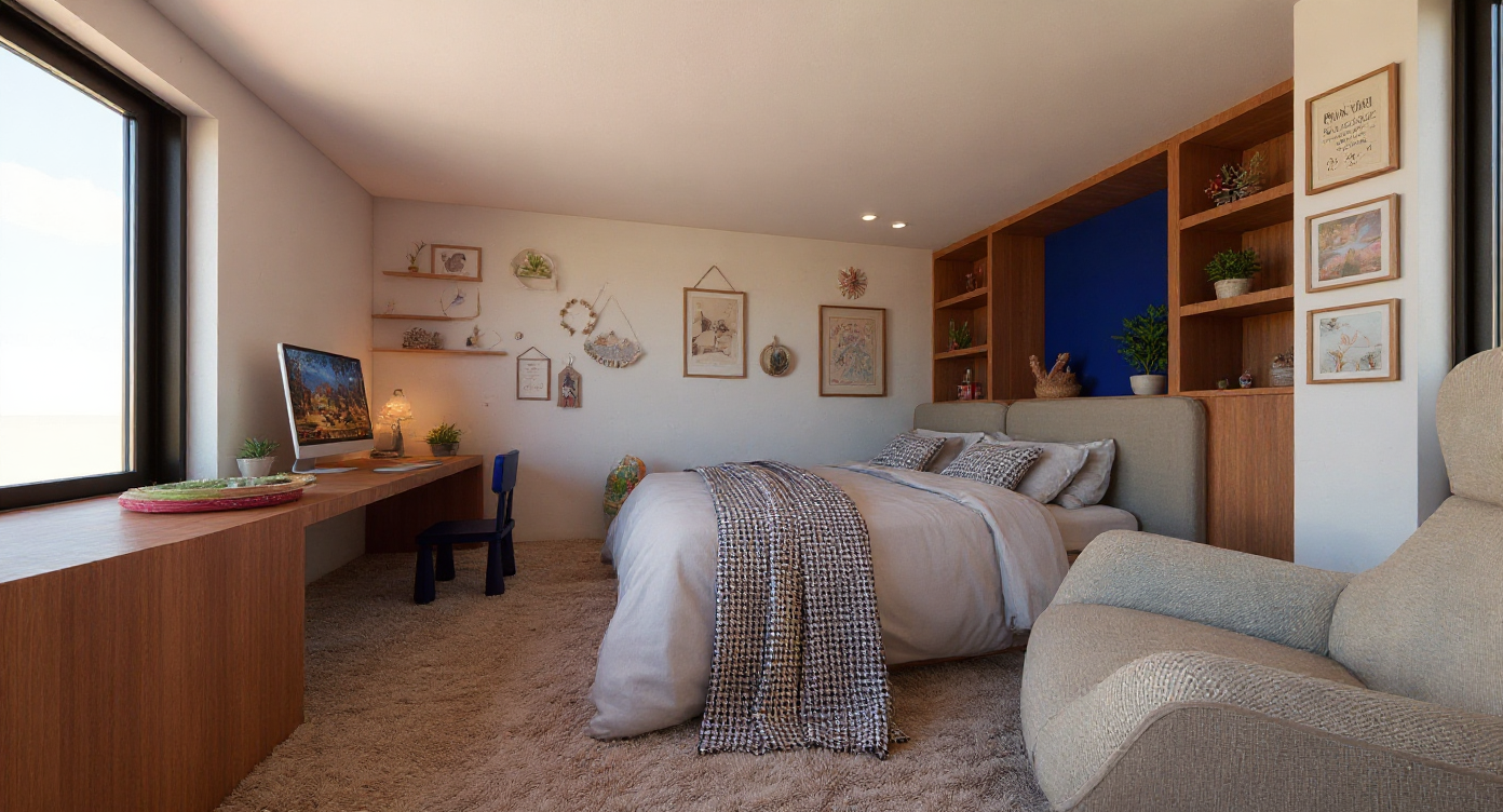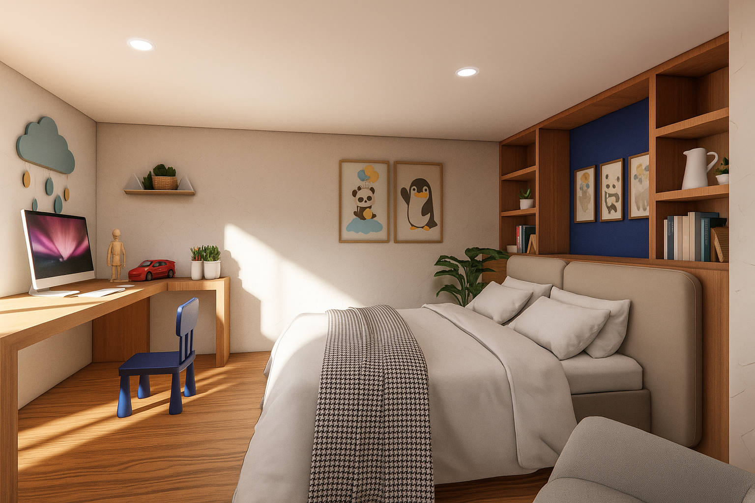 enhance the textures and add blue pillows on the bed
