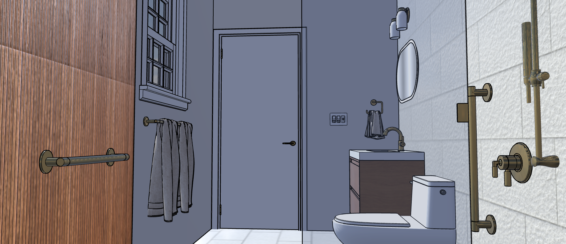 preserve all existing textures geometry materials colors and proportions overall scene is evenly brightened using neutral warm lighting only do not add highlights glow reflections or new light sources lighting comes only from mirror with soft white semi transparent backlit halo warm evenly diffused there is no sunlight nor any light source other than the vanity light and backlit mirror the shower head and all shower fixtures are not light sources and emit no light all metal hardware and accessories are brushed brass the vanity wall has tiles that are unicolor with 3d raw chiseled texture with a color code rgb 234 228 218 walls with no tile on them are painted in a rgb 234 228 218 color the light switches are white do not eliminate the shower glass still panel on the right side