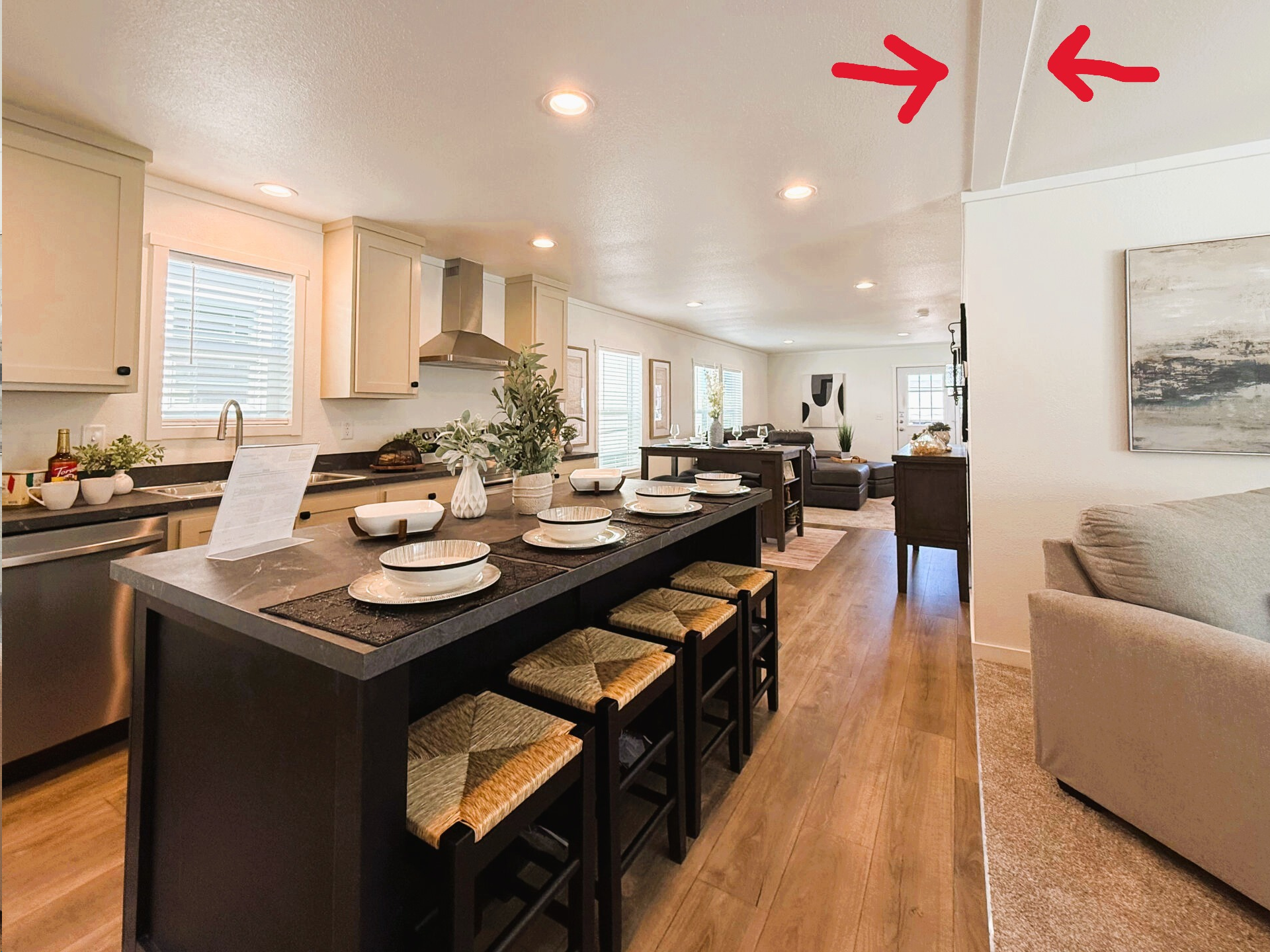 find the raised area on the ceiling between the two red arrows replace the raised area with a wood beam that runs from the front of the picture to the back between the red arrows