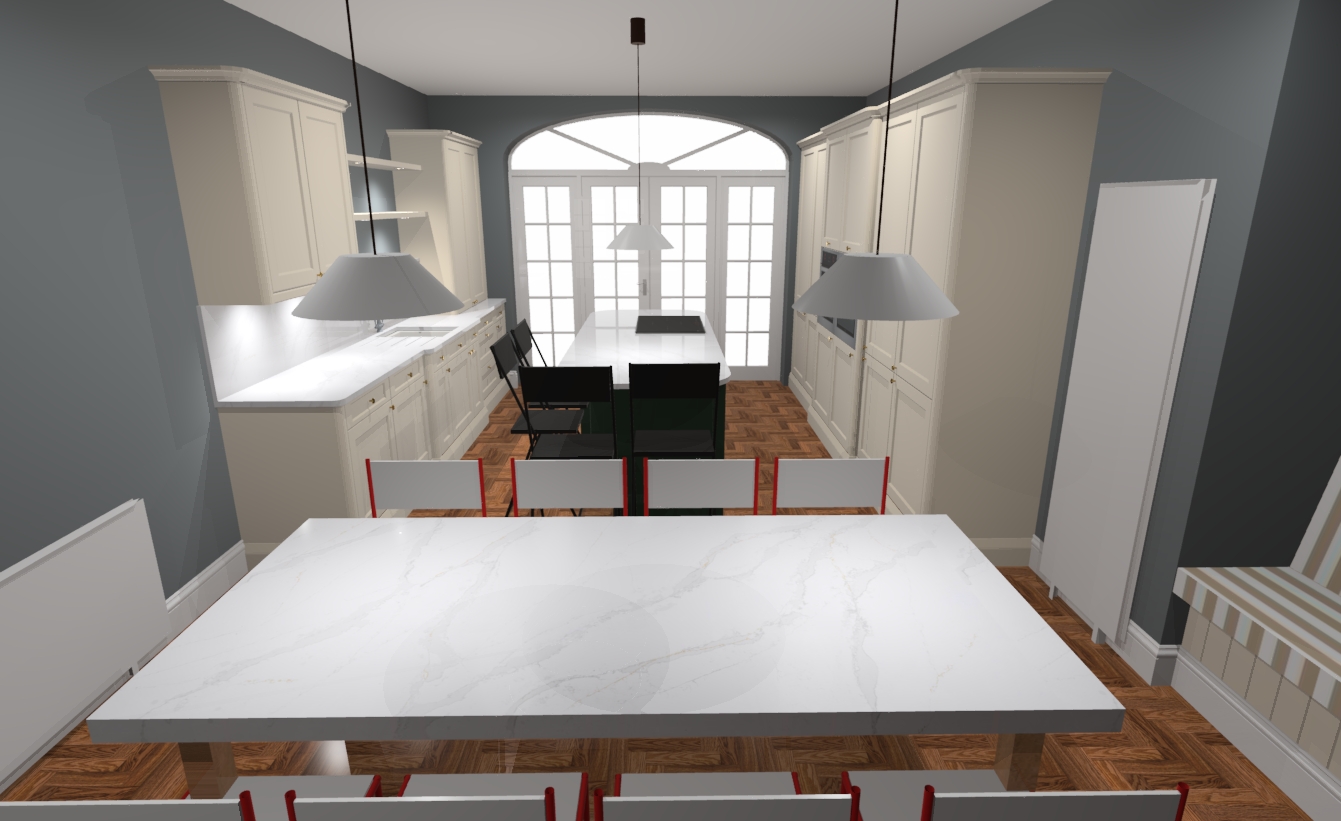 change chairs to beige curved back stools add items on shelves and worktops keep induction hob and undermount sink add pendant lights over island unit change red chairs to match colour and style of stools