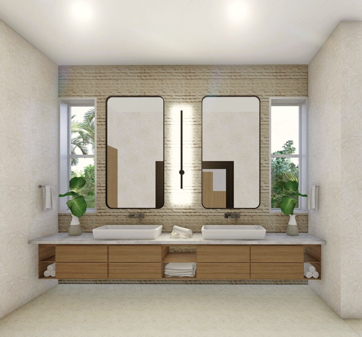 agrega mas y mejor iluminaci n natural elimina lampara del centro los espejos deben tener luz indirecta detr s