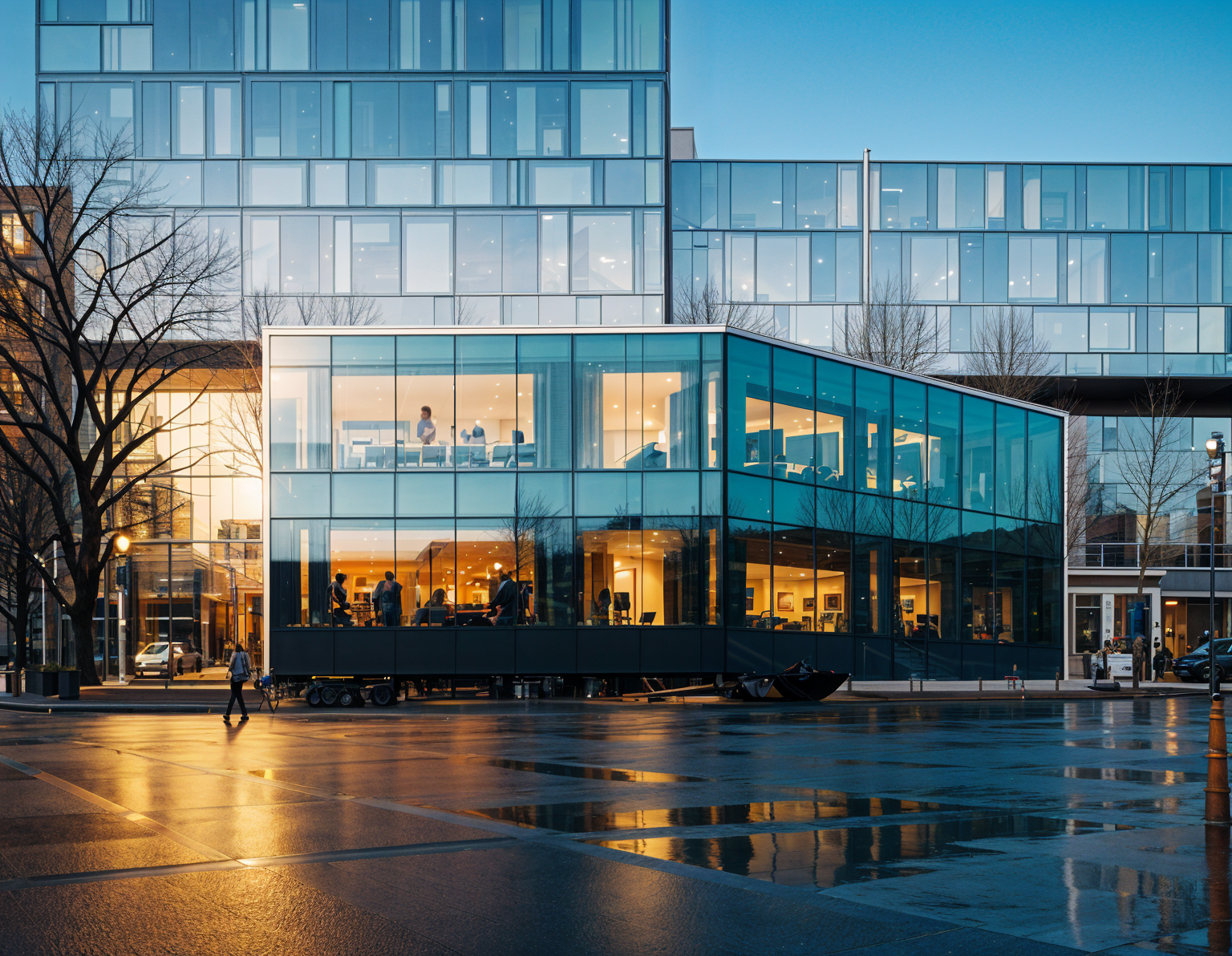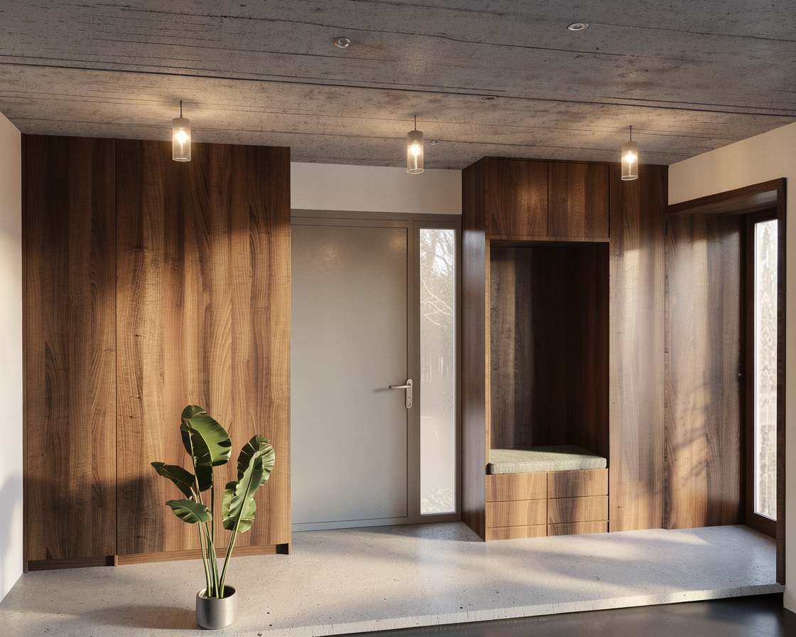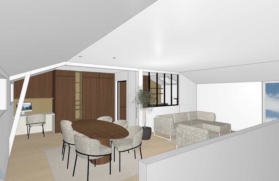 render a cozy and modern living and dining area the walls and ceiling are pure white enhancing the sense of space the dining table is a rich walnut brown surrounded by six elegant chairs upholstered in a soft textured beige fabric the floor is a warm light oak complementing the wooden elements the sectional sofa is plush and in a cream tone inviting relaxation a large window lets in soft natural light illuminating the room and creating a serene atmosphere add a minimalist work area with a beige desk and simple chair on the left a large potted plant with lush greenery adds an organic touch contrasting with the modern decor the atmosphere is tranquil and welcoming with an emphasis on neutral tones and natural materials