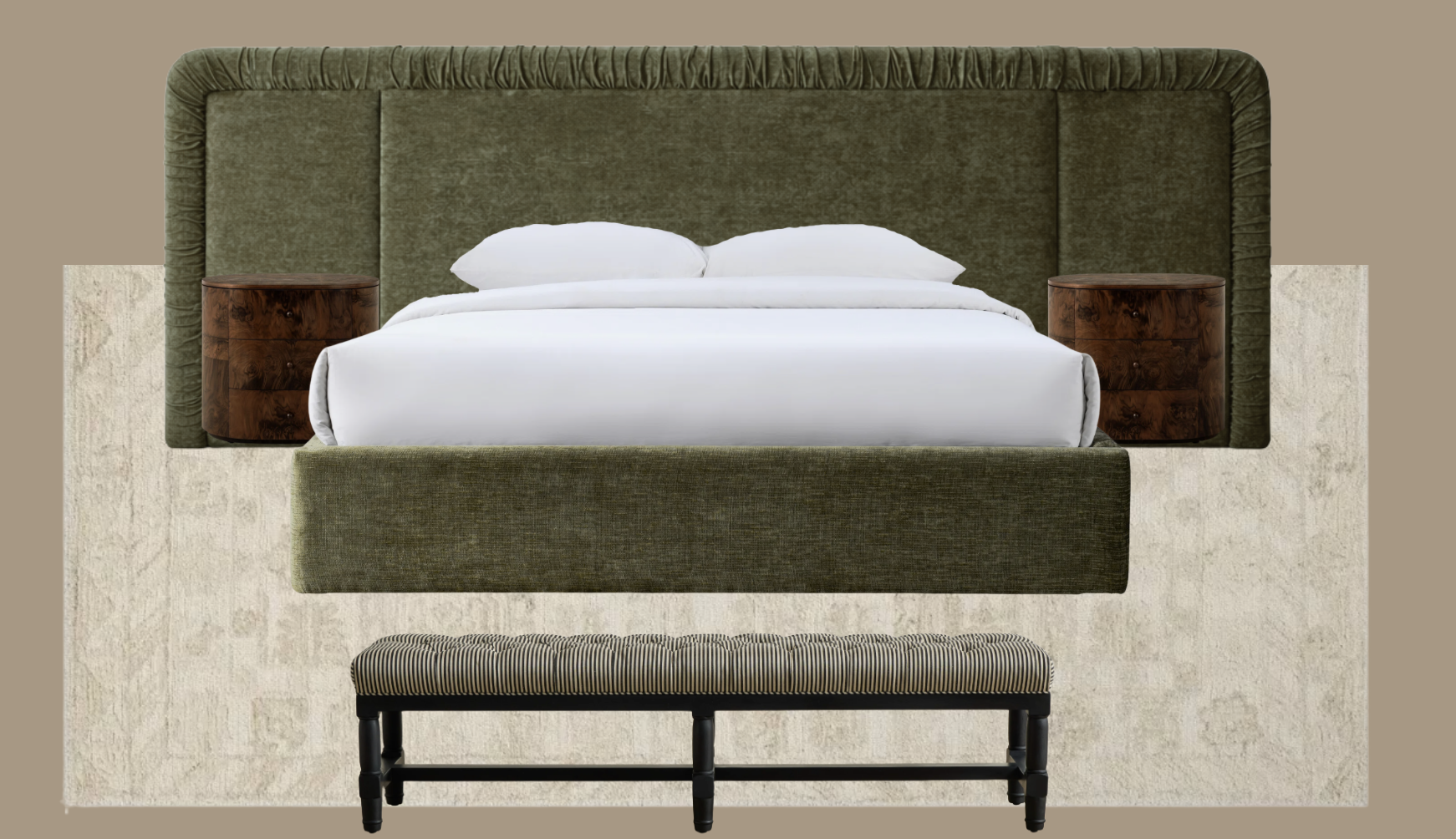 create a photorealistic rendering for a primary bedroom add walnut beams to the ceiling this is organ modern but very luxury i want the space to be very cozy use the very dark burl wood nightstands and the headboard continues behind the nightstands with sconce light mounted into he headboard above the nightstands make the lighting even moodier
