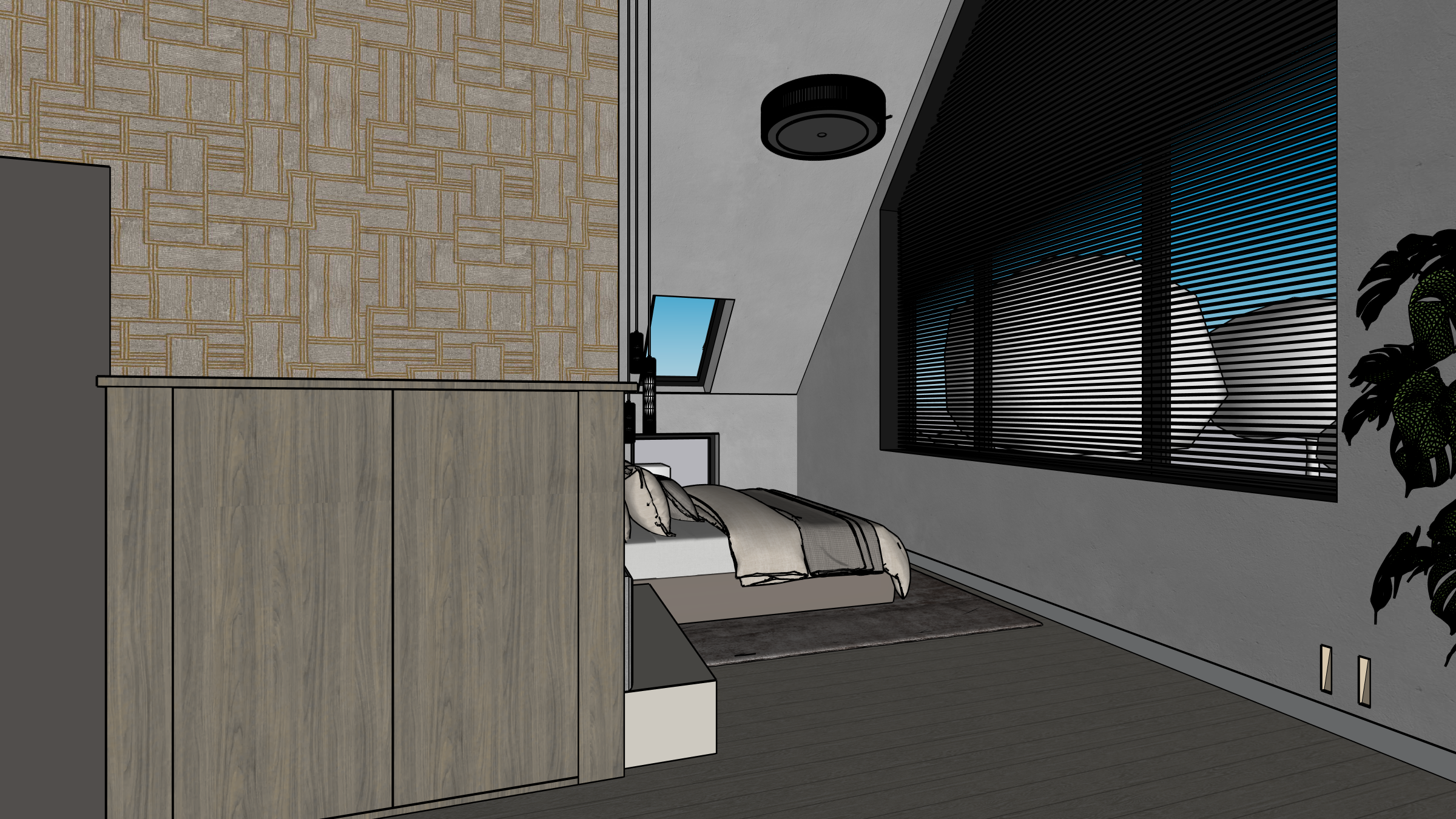 make a high end photorealistic render of the provided attic bedroom interior with soft natural daylight coming from the skylight and window creating gentle shadows and a warm calm atmosphere keep everything exactly the same same geometry same proportions same built in wall panels same bed same bathroom view same materials same colors and same furniture positions do not add or change any objects materials or finishes the existing pendant lights next to the bed should be turned on with a subtle warm glow in the bathroom visible through the opening add a soft integrated lighting effect behind the mirror and a gentle ambient light in the space consistent with realistic architectural lighting without adding new fixtures or changing the design the bed styling should remain soft and natural as already present decorative elements should remain minimal and exactly as in the scene do not introduce new items focus on realistic material textures accurate lighting behavior and a calm luxury residential atmosphere