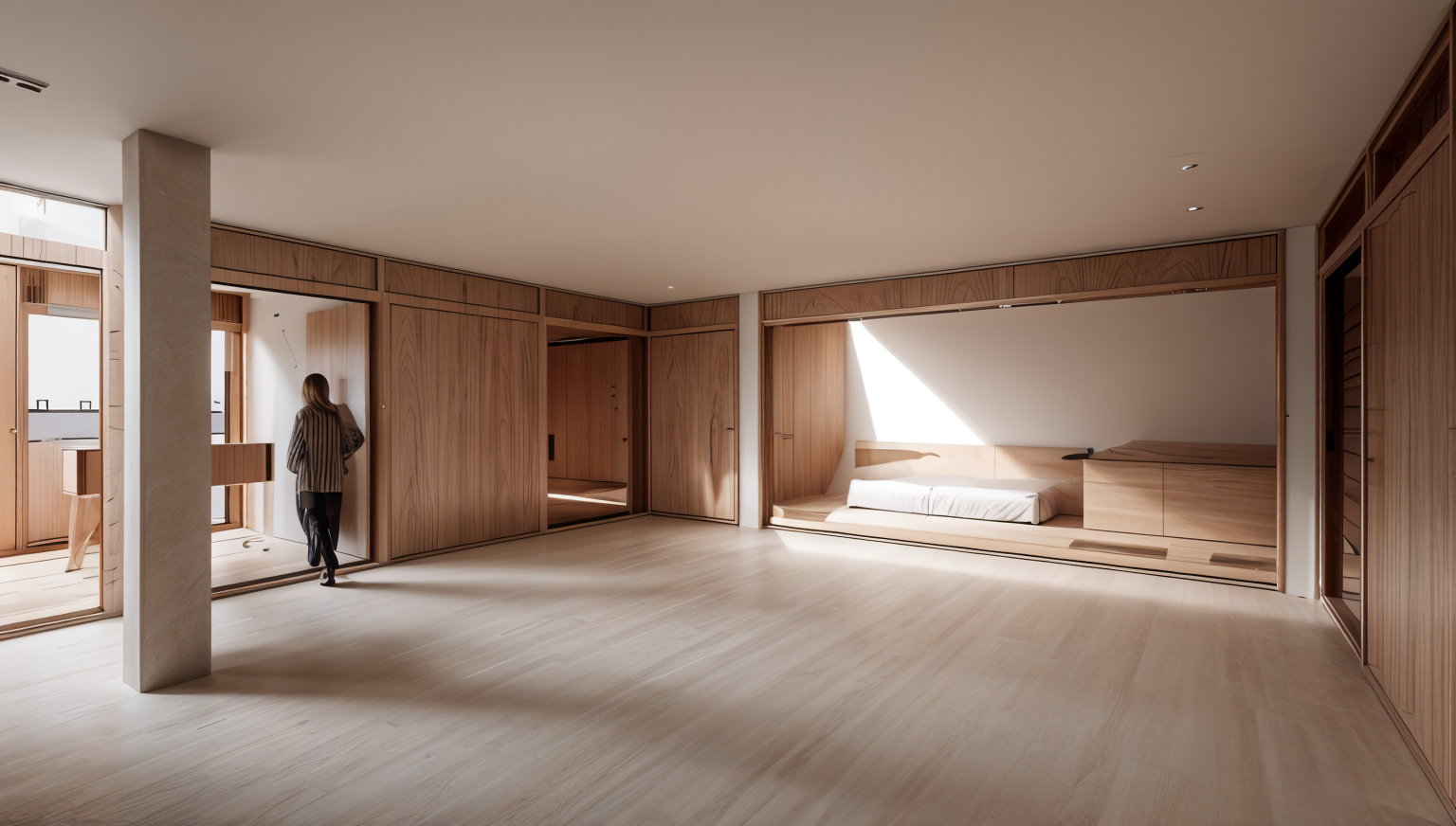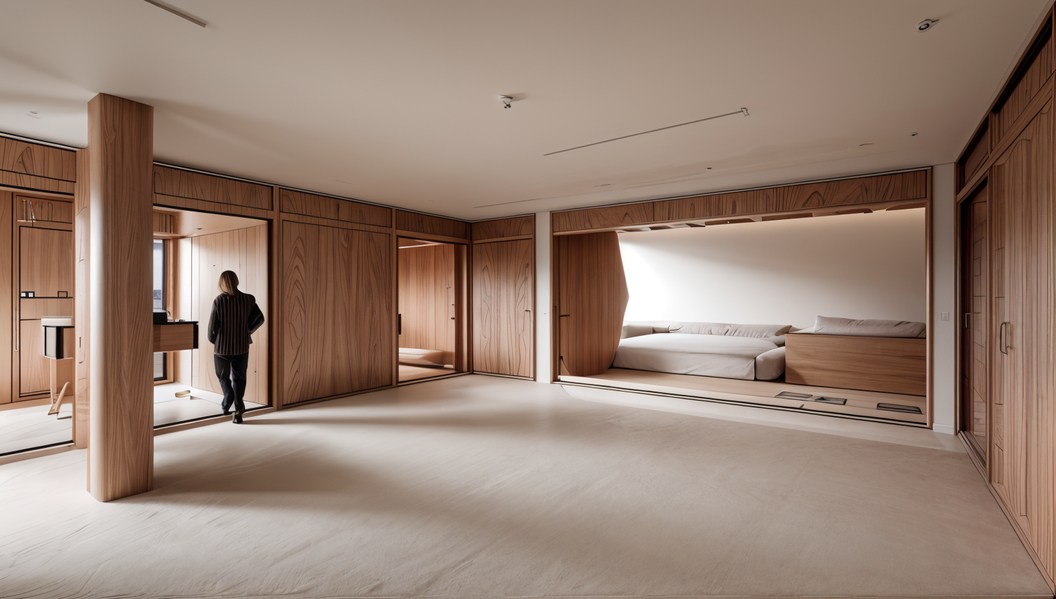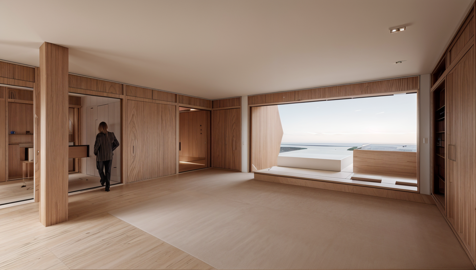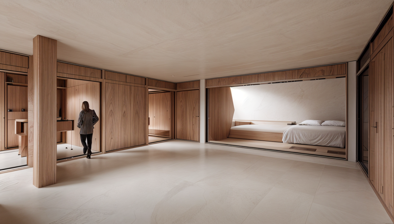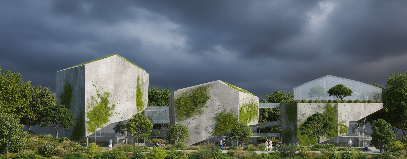 render a modern architectural scene showcasing three uniquely shaped buildings with clean full moss covered concrete facades and large glass windows surround the buildings with lush green trees in various shades from emerald to lime add subtle shadows and highlights to emphasize the structure s angles the sky should be moody include people in the scene wearing casual attire of light pastel colors leisurely walking or sitting the atmosphere should feel open airy and inviting with a sense of contemporary sophistication
