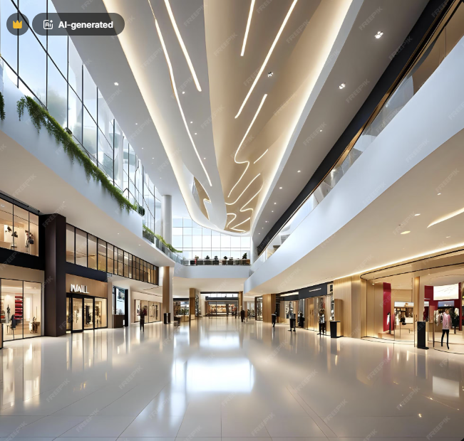 exterior shot create me a surrounding render from a luxury mall center in abu dhabi i want to use the picture as a background i need panoramic proportion of the render it should be very bright and contain luxury elements