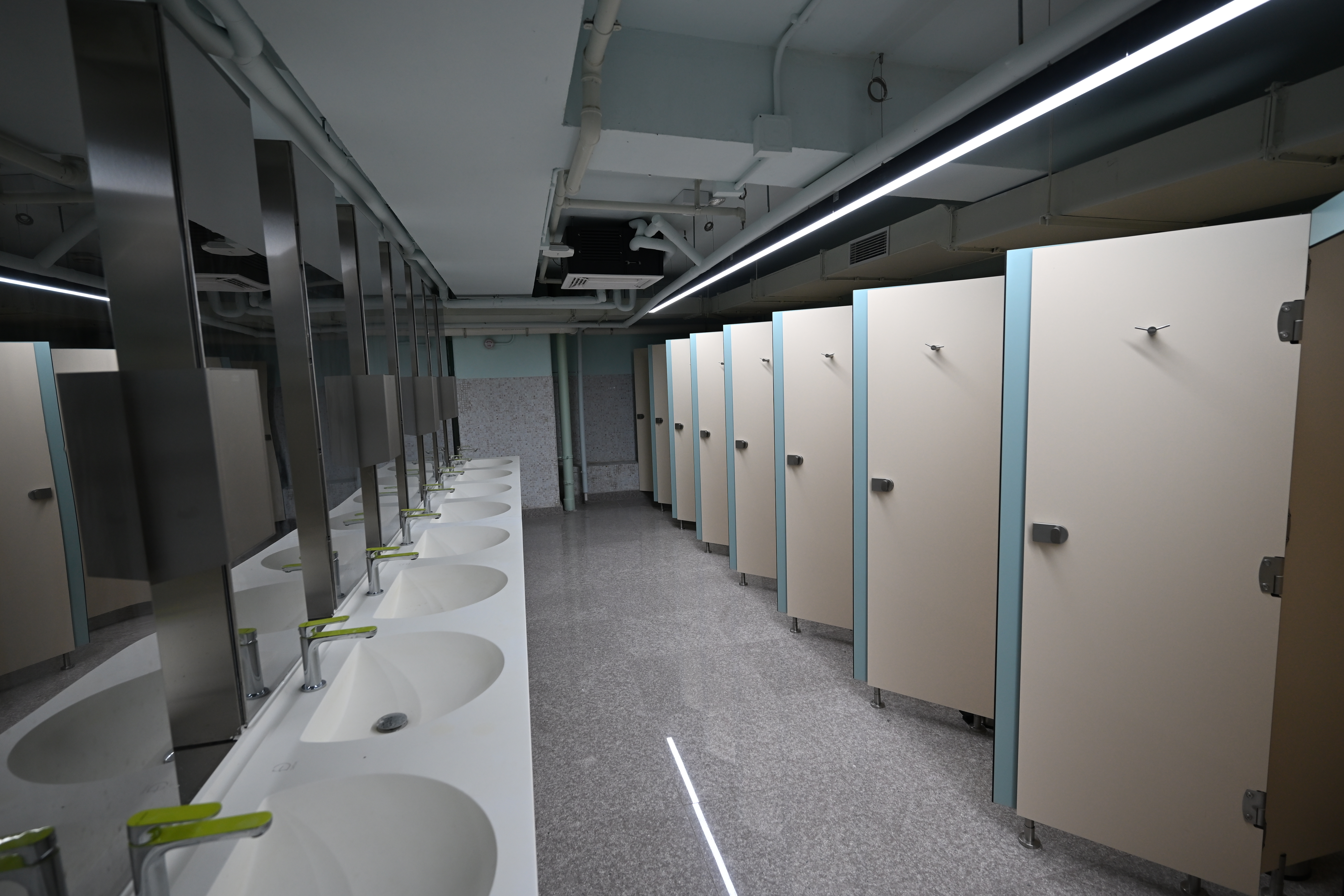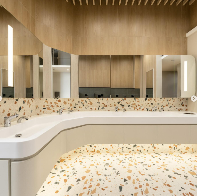 interior shot create an elegantly minimalistic classroom interior with a serene atmosphere feature softly illuminated off white walls and ceiling exuding warmth design light wood paneling on the walls and lower shelves providing a natural calming contrast arrange hexagonal white tables on smooth light beige flooring creating a clean and modern aesthetic insert ambient light from elongated horizontal windows casting soft shadows and enhancing the peaceful ambiance include unobtrusive sleek gray caster wheels under tables for subtle movement potential