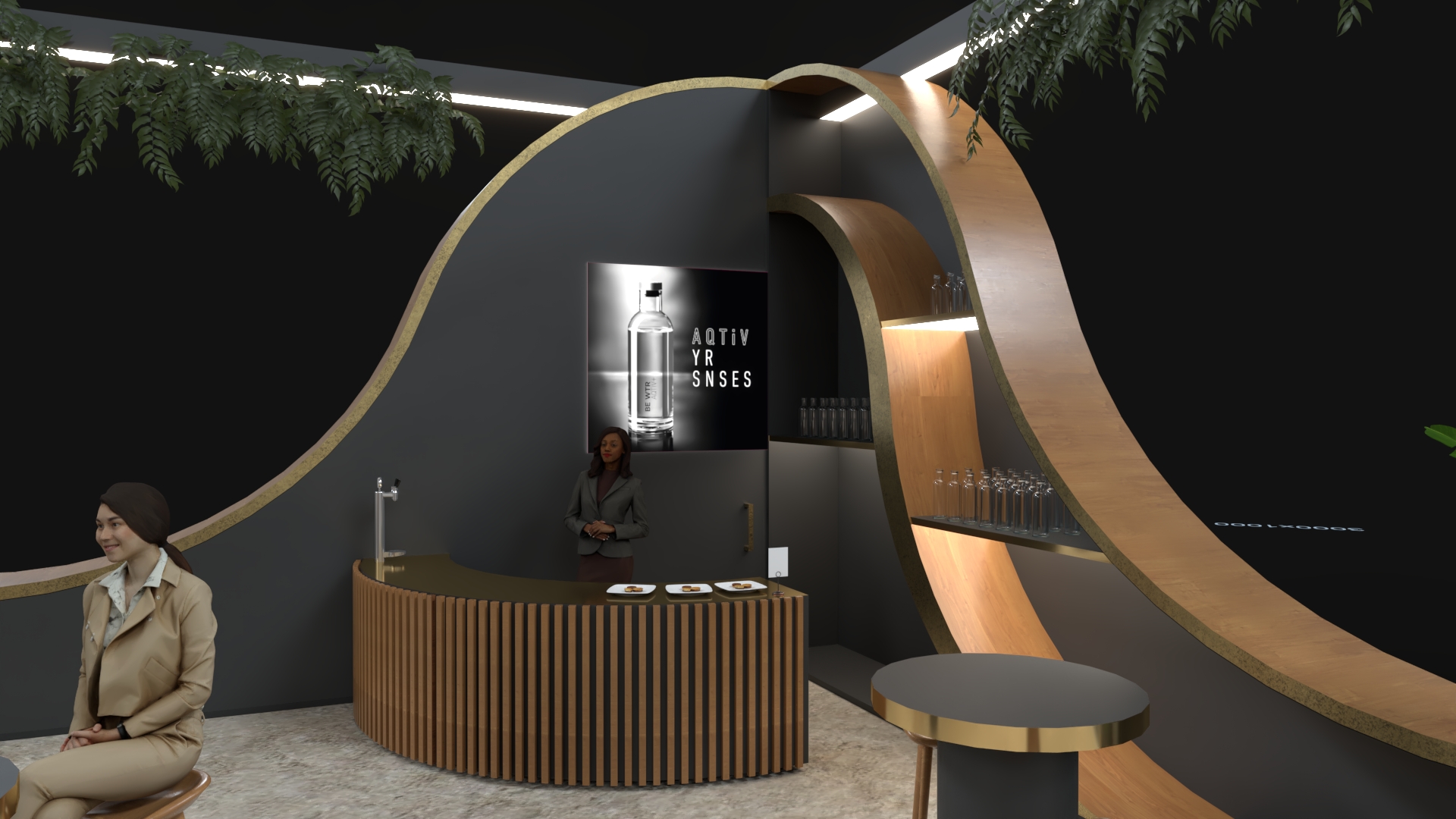 leave the setting as it is i don t want you to change the elements just give them a more realistic feel i want you to place the stand in a culinary fair setting like a warehouse with people walking around and going about their business
