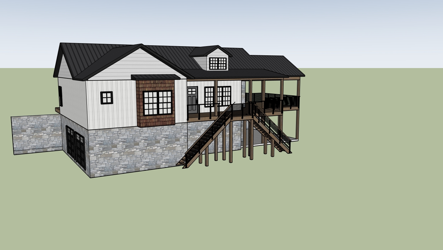 home sits in appalachian mountains with mature trees on the left side concrete driveway enters on the bottom level left side with two garage doors not facing the front stone foundation retaining wall cable railings small mountain view on right with mature evergreen trees mature landscaping on left front
