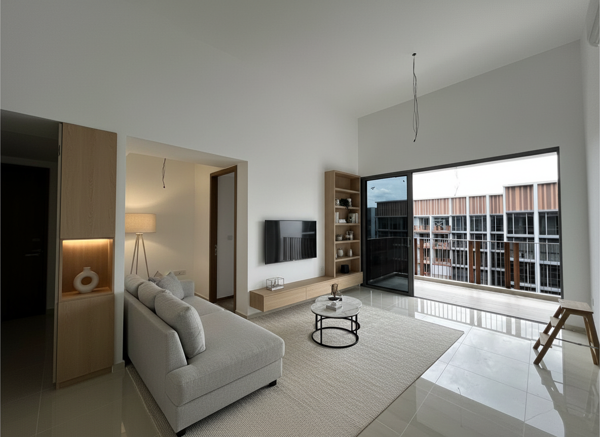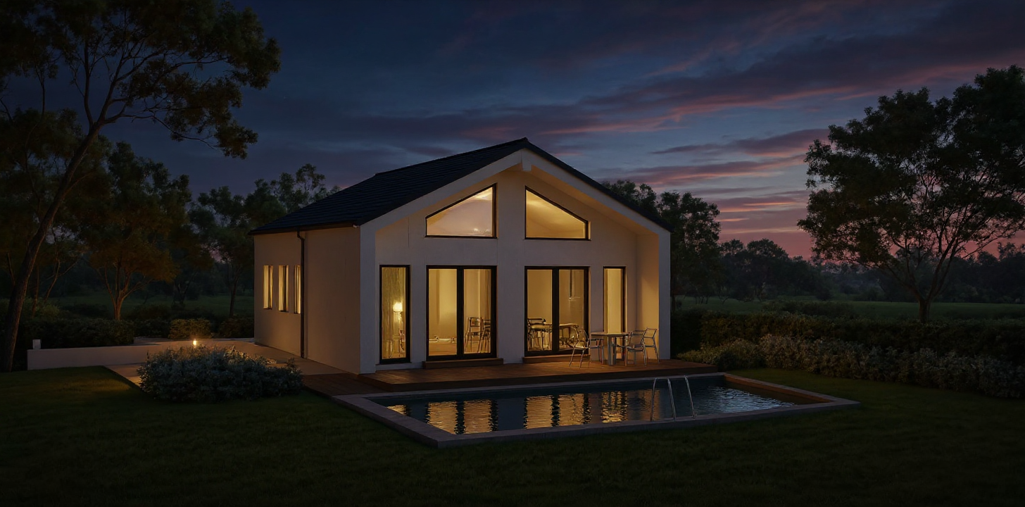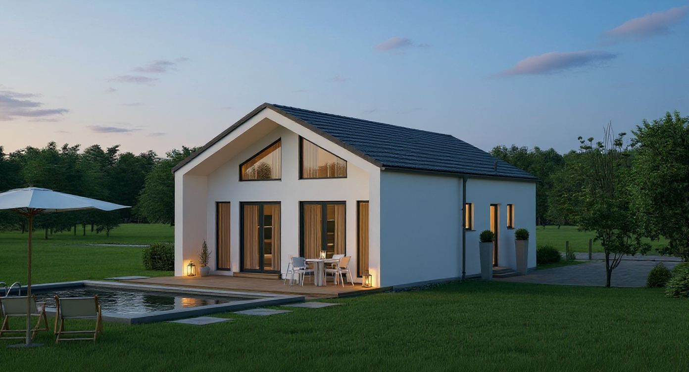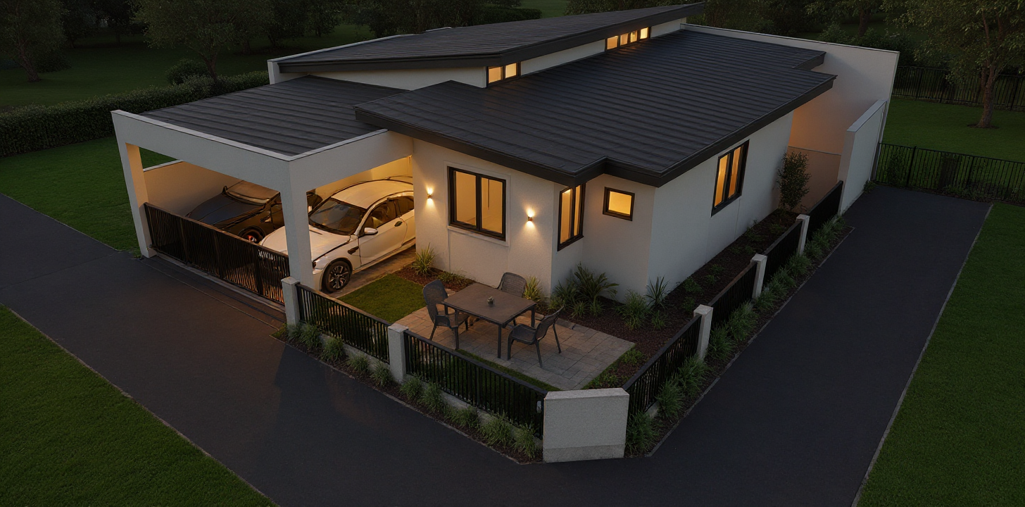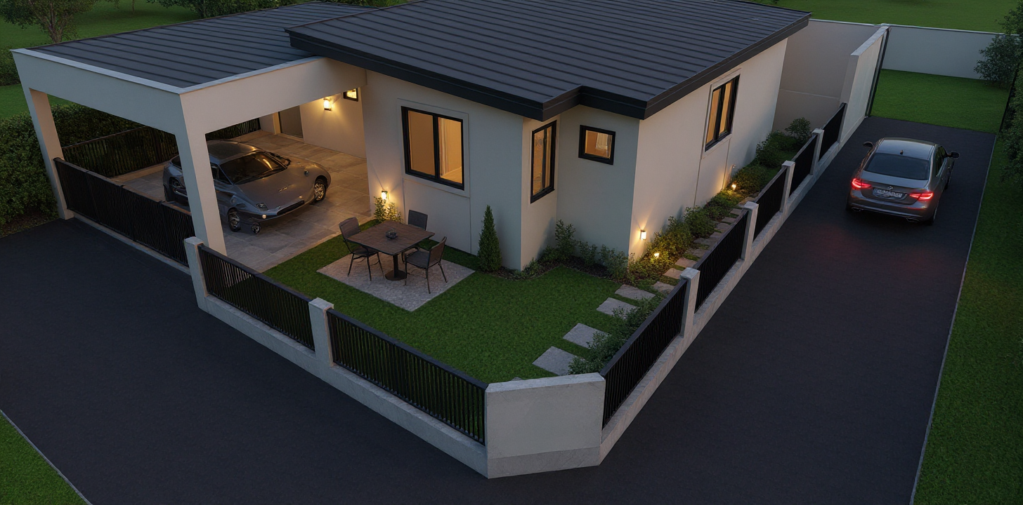 a modern ranch style structure with the following features 1 medium gray asphalt shingles 2 40 high river rock wainscot all along the front base of the house 3 the existing large window openings one located in the middle of the elevation and the two on the right hand side of the elevation are a pair of white single hung windows with divided light top and bottom windows 4 black shutters on the sides of each window 5 white vertical board batten siding from the top of the stone up to the roof overhang 6 the existing front door is aligned in the same plane as the front windows to the left the door panel is black and has a 9 section divided light window in the top half of the door 7 the glazing to the right side of the garage is a pair of 36 wide white arcadia patio doors with divided lights 8 the wood fascia will be painted black to match the garage doors 9 the 40 high river rock wainscot wall will extend to the right from the garage paster the arcadia patio doors to enclose a new courtyard 10 courtyard wall extending 16 to the right side of the garage 11 the sectional garage doors will be black with a 3 long x 6 window on the right end of each panel 12 starting at the right front corner of the garage extend a river rock courtyard wall to the right past the patio doors 13 add divide light to the lower two windows on the right 14 there is only one existing chimney adjacent to the garage will have river rock that matches the house wainscot the rendering should be specific to my instructions only no alternate walls or details allowed