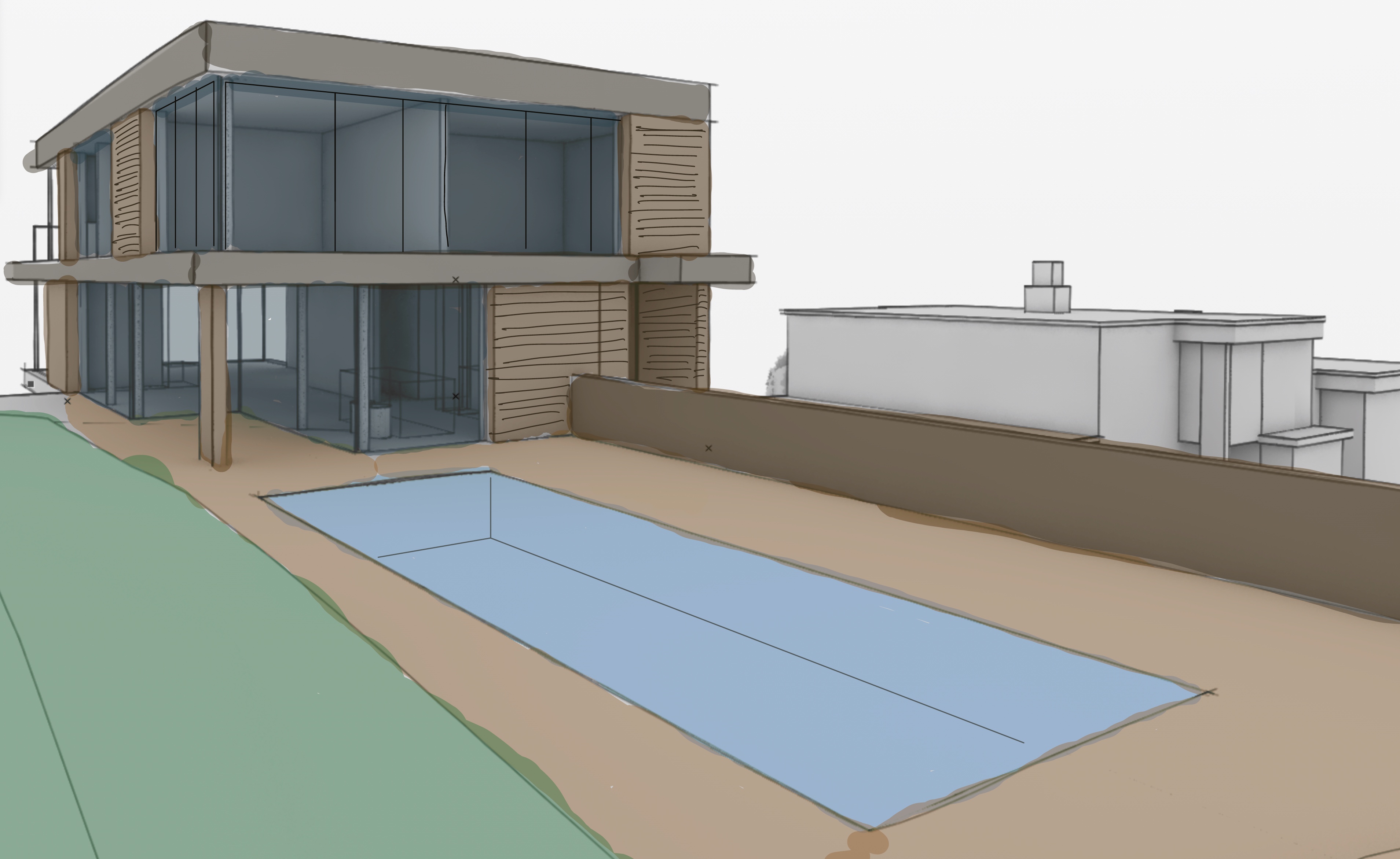 genau dieses rendering berarbeiten fotorealistisches foto exakt dieselbe perspektive und kameraposition wie das hochgeladene referenzbild 100 identische geometrie exakt gleiche anordnung exakt identische fensterpositionen mit gleichem ausblick durch die fenster weiches nat rliches tageslicht leicht schr g einfallende sonne durch die fenster r ume hinter den fenstern k nstlich ausleuchten sanfte realistische schatten realistische materialien echte texturen hochwertige oberfl chenreflexionen echte menschen echte autos pflanzen mit echten b umen und str uchern ersetzen gr ne fl chen mit wiese rasen und einigen b schen ersetzen sehr realistische umgebung nat rlicher himmel mit leichter bew lkung canon eos r5 35 mm festbrennweite f 2 8 nat rliche farbwiedergabe leicht warme farbstimmung golden hour feeling hyperrealistisch dslr qualit t raw aufnahme 8k aufl sung extrem scharf perfekte tiefensch rfe professionelle architekturfotografie haus im hintergrund rechts mit hellen klinkerfassadensteine