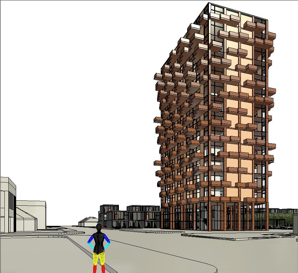 render the female with brown hair and white jacket standing facing away from camera with high detail a bright sunny day travertine facade and timber balconies and columns