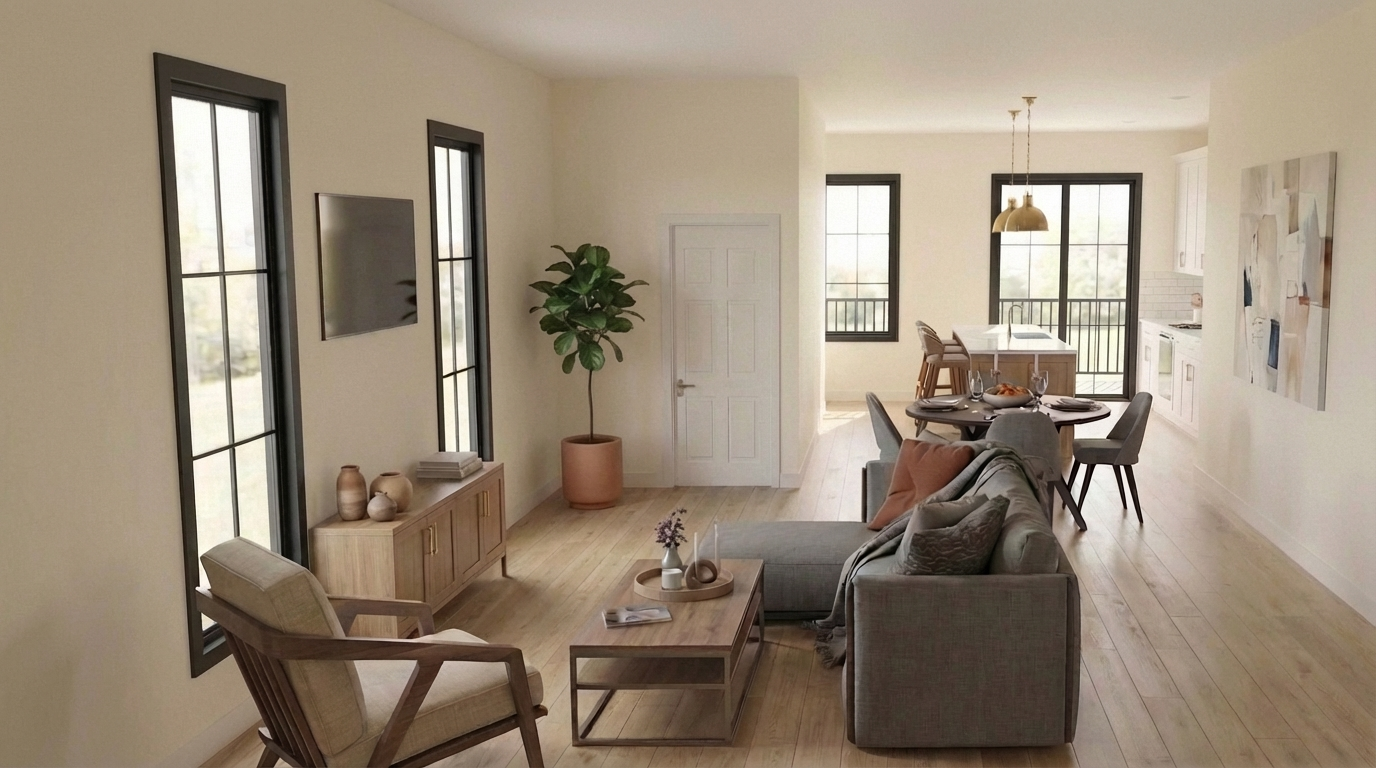 leave everything the same but change the door to a taller horizontal panel door add a boho style rectangular area rug in the great room under the furniture change the art so it looks more expensive but still inviting