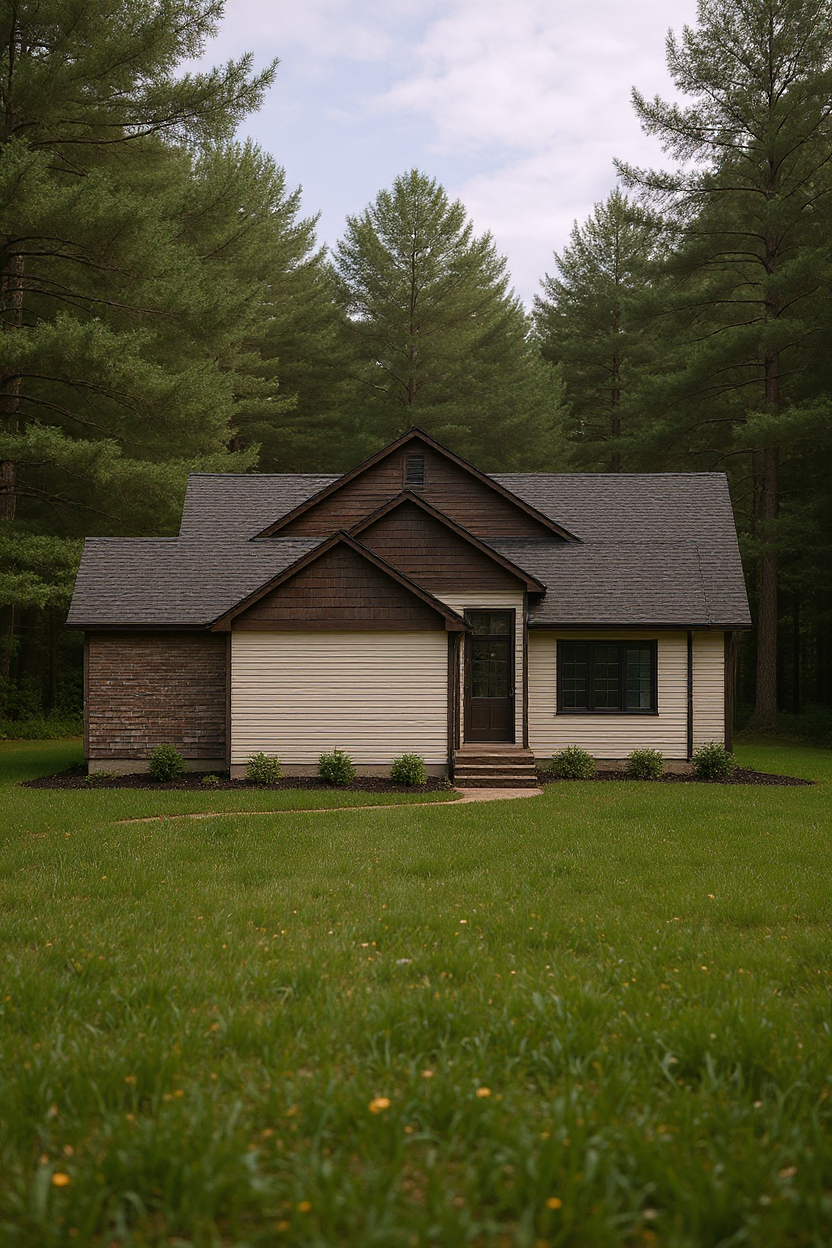 partly cloudy lake house is on a cliff overlooking lake erie water reflected in windows gray siding white trim white windows