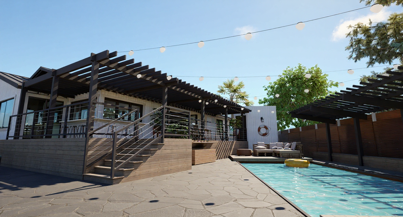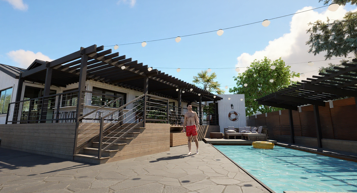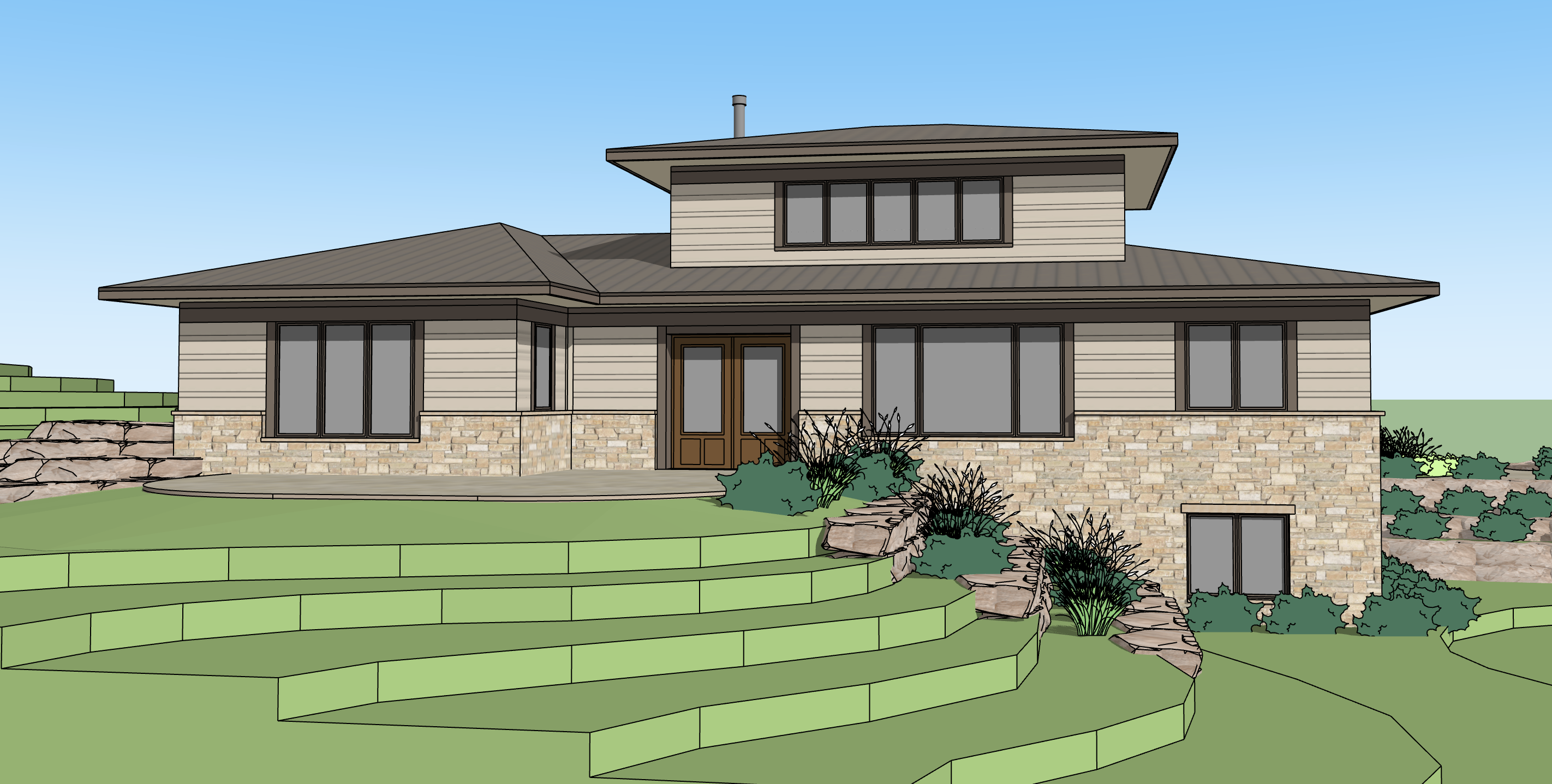 make this look photo realistic smooth out the topography show real plants in the foreground and some trees in the background stay true to the building geometry window placement etc