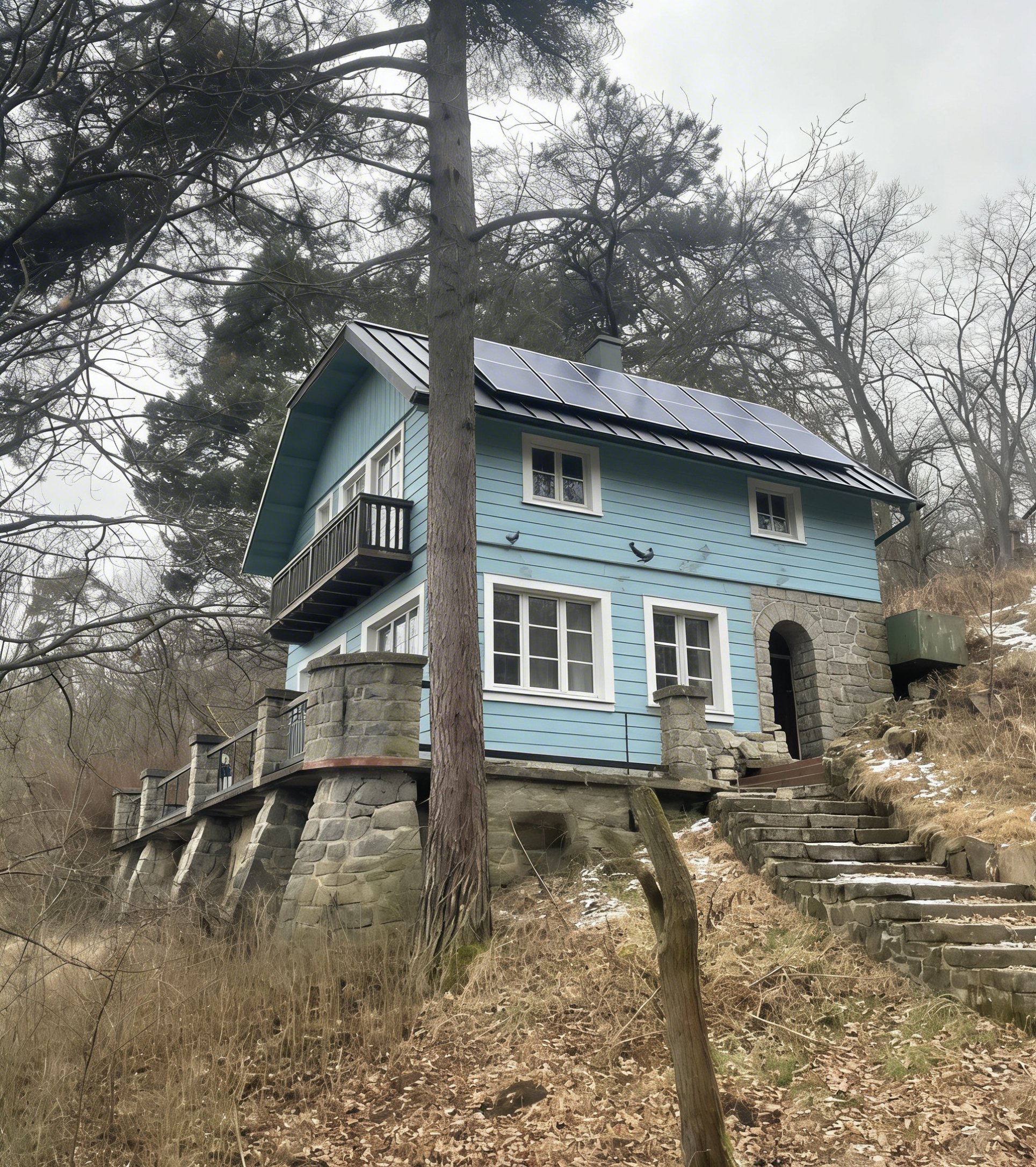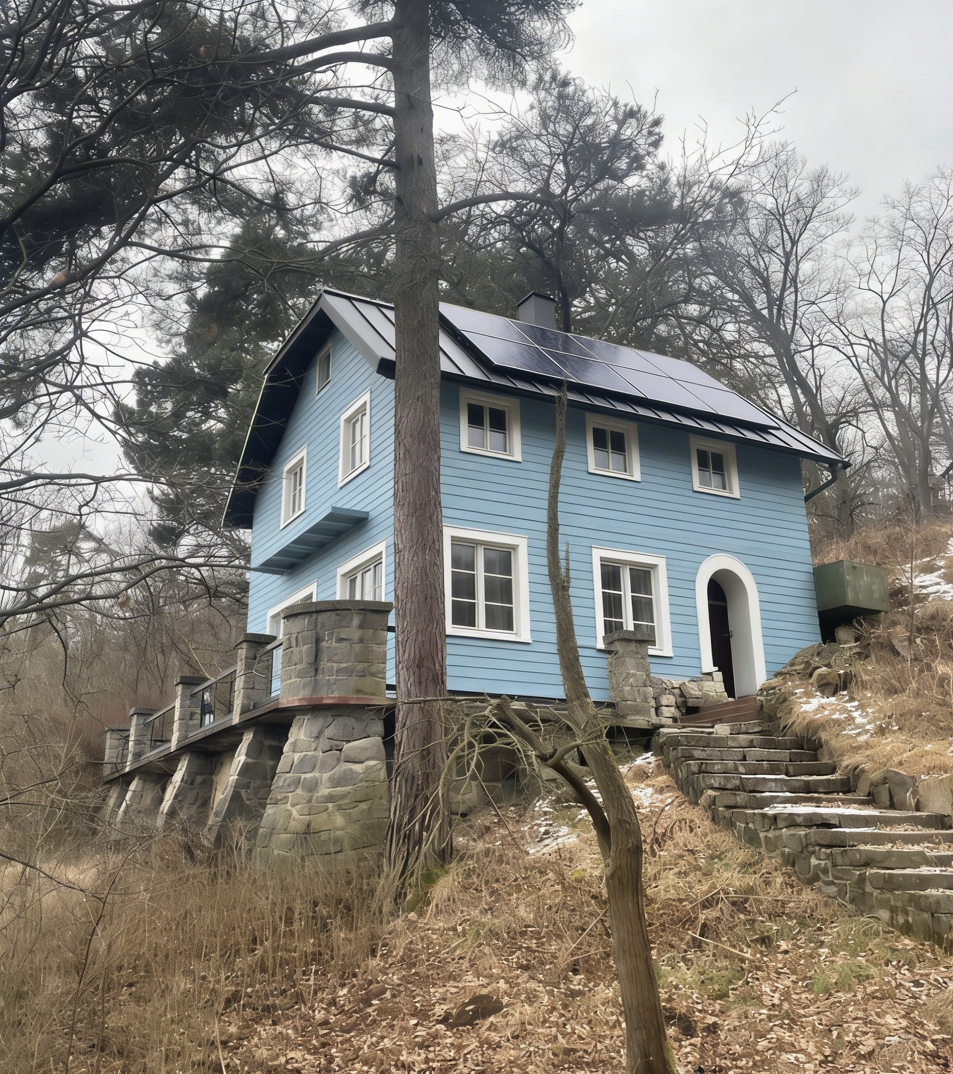 natural stone in the ground floor white window frames pigeon light blue wooden horizontal facade in 1st floor antracite metal roof solar panels on the roof
