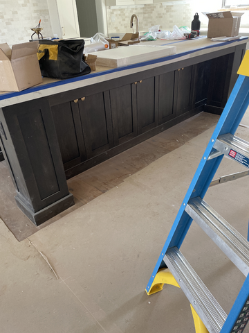 do not change the cabinets in any way preserve the exact cabinet colors materials finishes dimensions door and drawer styles hardware spacing alignment and all geometry exactly as shown do not alter the countertop shape backsplash appliances flooring lighting fixtures or wall structure only remove the construction materials clutter and mess from the scene clean the room and make it look finished and staged add a few simple tasteful home accessories appropriate for the style of the space but do not add or remove any furniture windows or architectural elements maintain the original lighting direction and realism enhance clarity and polish the photo while keeping the cabinetry and room design completely unchanged do not alter the lighting to keep the cabinet colors as they are in the image add new flooring stage the countertop for a kitchen island