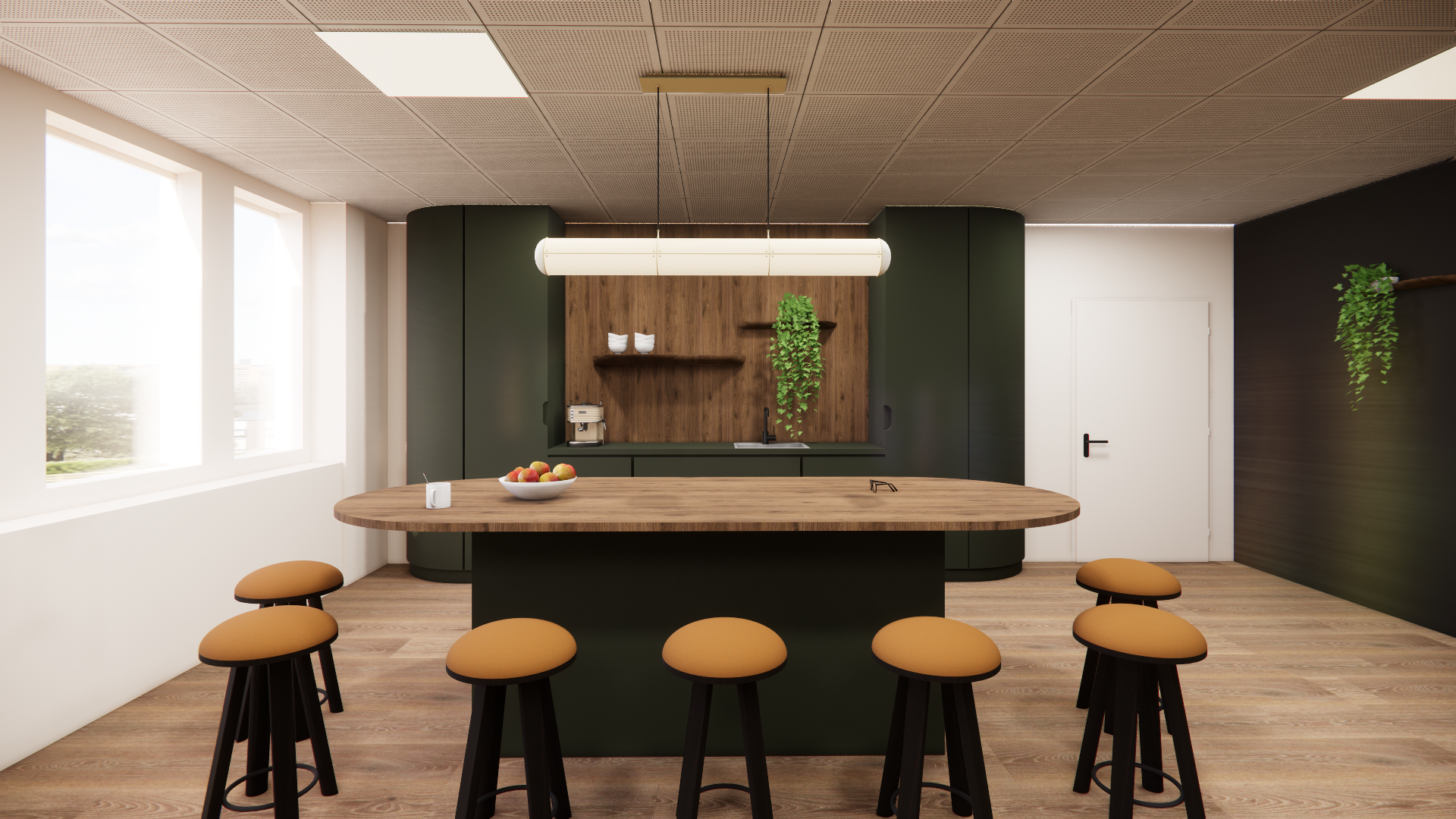 bright interior of a modern and rustic coffee corner with a serene ambiance by terracotta wool cushioned chairs t a large window lets in natural light creating a bright and airy atmosphere with a view of the cityscape the wooden floor is a natural brown enhancing the cozy feel diffuses warm light the atmosphere is relaxed and fun with young people laughing