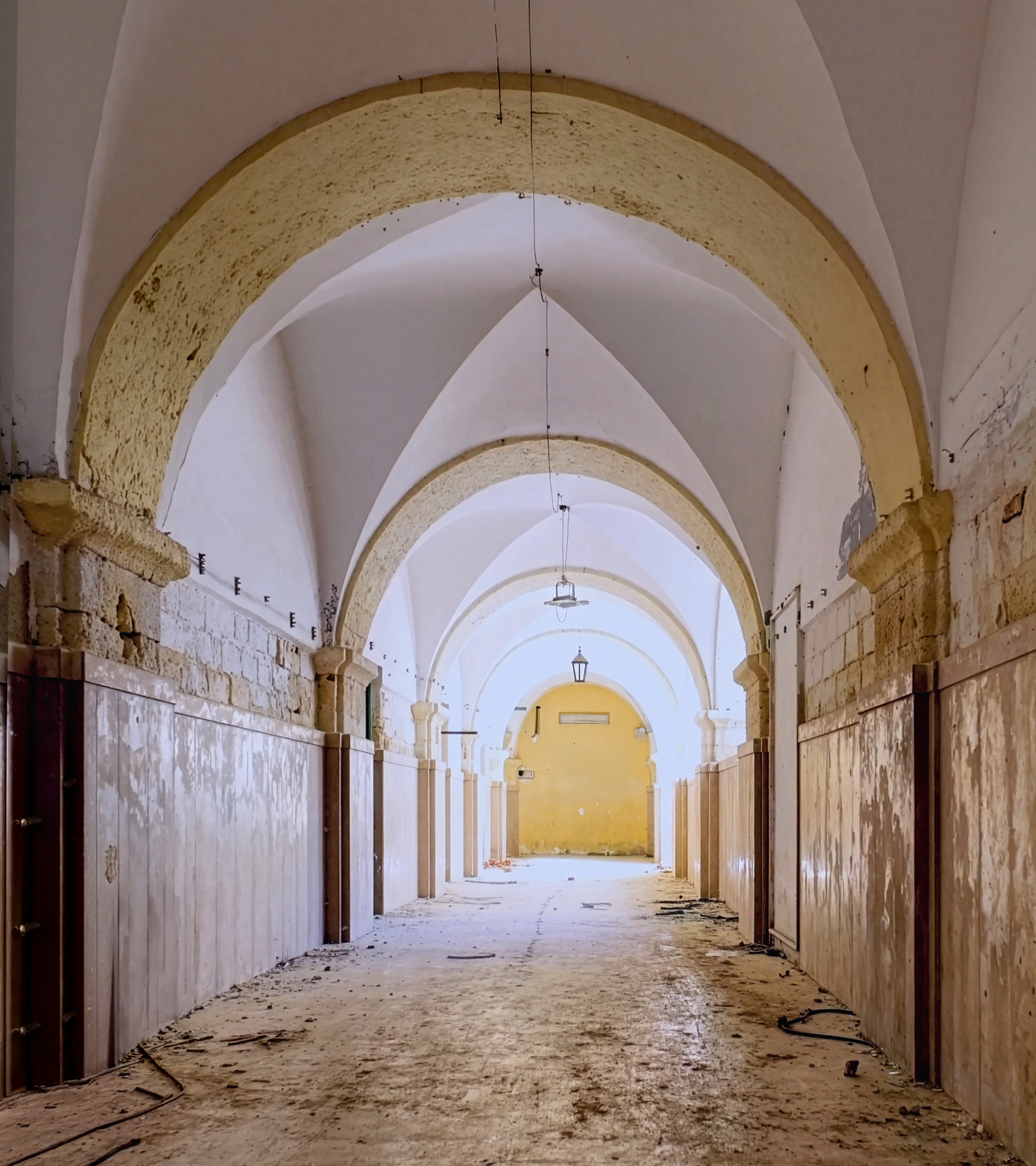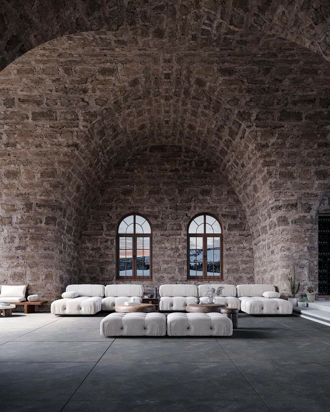 exterior shot transform historical gallery into contemporary common area hyper realistic architectural view of a continuous 19th century portico gallery transformed into a contemporary student housing common area maintain the original historical vaulted ceiling structure and stone columns fill the entire space with a dense lively crowd of young university students socializing reading and moving creating a strong sense of community and convivialit integrate modern super contemporary modular furniture vibrant colored seating pods geometric study tables and tech integrated workstations implement a sophisticated warm and inviting contemporary lighting scheme integrated led linear lights along the vaults architectural spotlights emphasizing the columns and ambient floor lamps the mix of historical texture and sleek new materials wood colorful textiles polished concrete floor is sharp and detailed dynamic composition bustling atmosphere high end architectural photography 8k resolution cinematic lighting