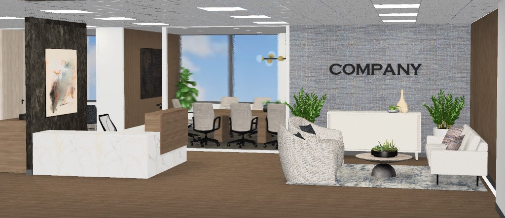make the rendering look like a beautiful high end office interior keep the same colors furniture architecture and we need the lighting to reflect office lighting where there are minimal shadows the wall to the left needs to be dark steel finish and we need to maintain the more grey toned colors i need to keep the blue sky in the windows the credenza needs to be all white laminate