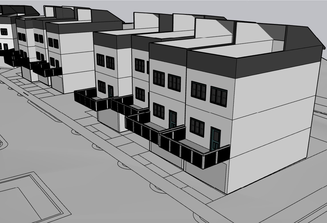 this is a close up of the townhomes with light wash wood darker brown roofs those open roofs should each be unique and personalized porches some with hanging vegetation and each one has an outlined driveway can you put a car in one of the driveways and vegetation between each sidewalk there is a road infront of the row of townhomes a darker grey asphalt the plantigns should be southern georgia type plantings variety in height yellowish green some with a natural purple hugh