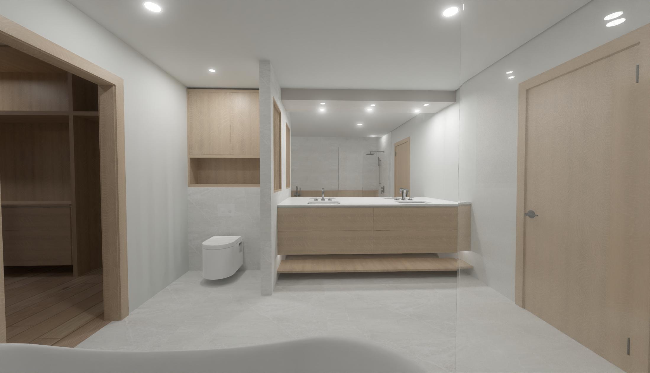 render a minimalist and modern bathroom with a serene and calming atmosphere the walls are a soft powdery white creating a clean and bright ambiance the wooden cabinets and doors feature a warm light oak finish for a natural touch the floor consists of smooth light gray marble tiles that enhance the space s elegance incorporate sleek silver fixtures for the taps and shower fittings adding a contemporary feel the lighting is soft with recessed ceiling lights providing a gentle even glow the overall palette should exude tranquility and sophistication blending warm wood tones with cool marble for a balanced aesthetic