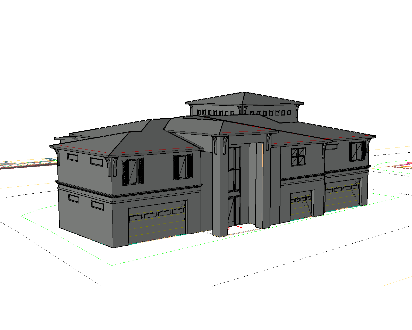 a modern farmhouse white and with metal dark gray roofing the upper portion oif the house have white aboard and batten while the rest of the house including the right most wall has with white hardi plank horizontal exterior walls the lower portion of the house are with light gray color walls board and batten the front columns have a light gray color plain paint accent the foyer entrance is cladded with greyish wood the garage doors are canyon ridge chevron and are covered with shed roof overhang surrounded by lush greenery in florida setting surround it with palm trees and a dawn setup with lights lit up there is a big backyard and a swimming pool and a lake at the rear