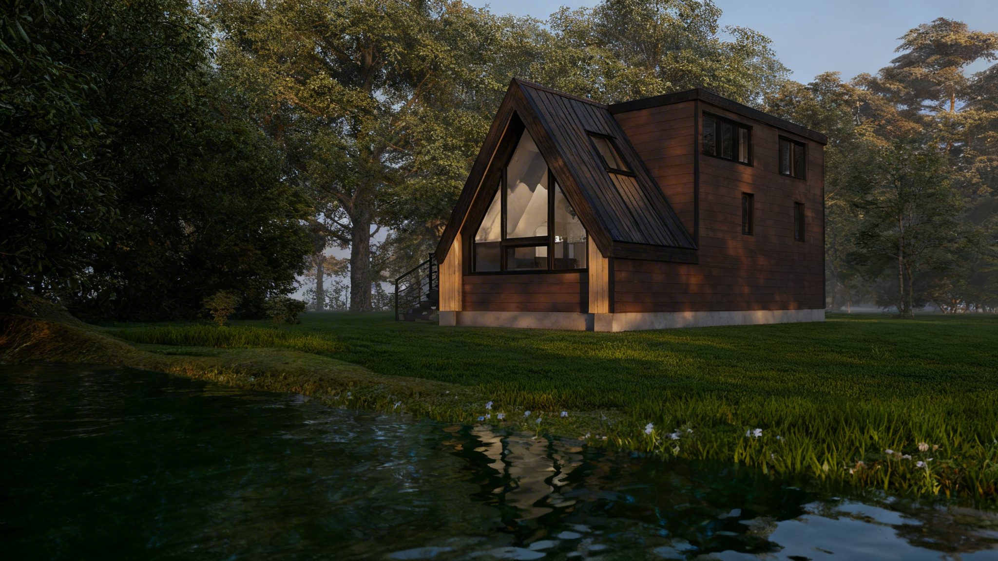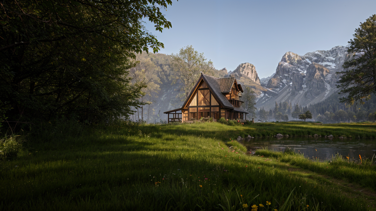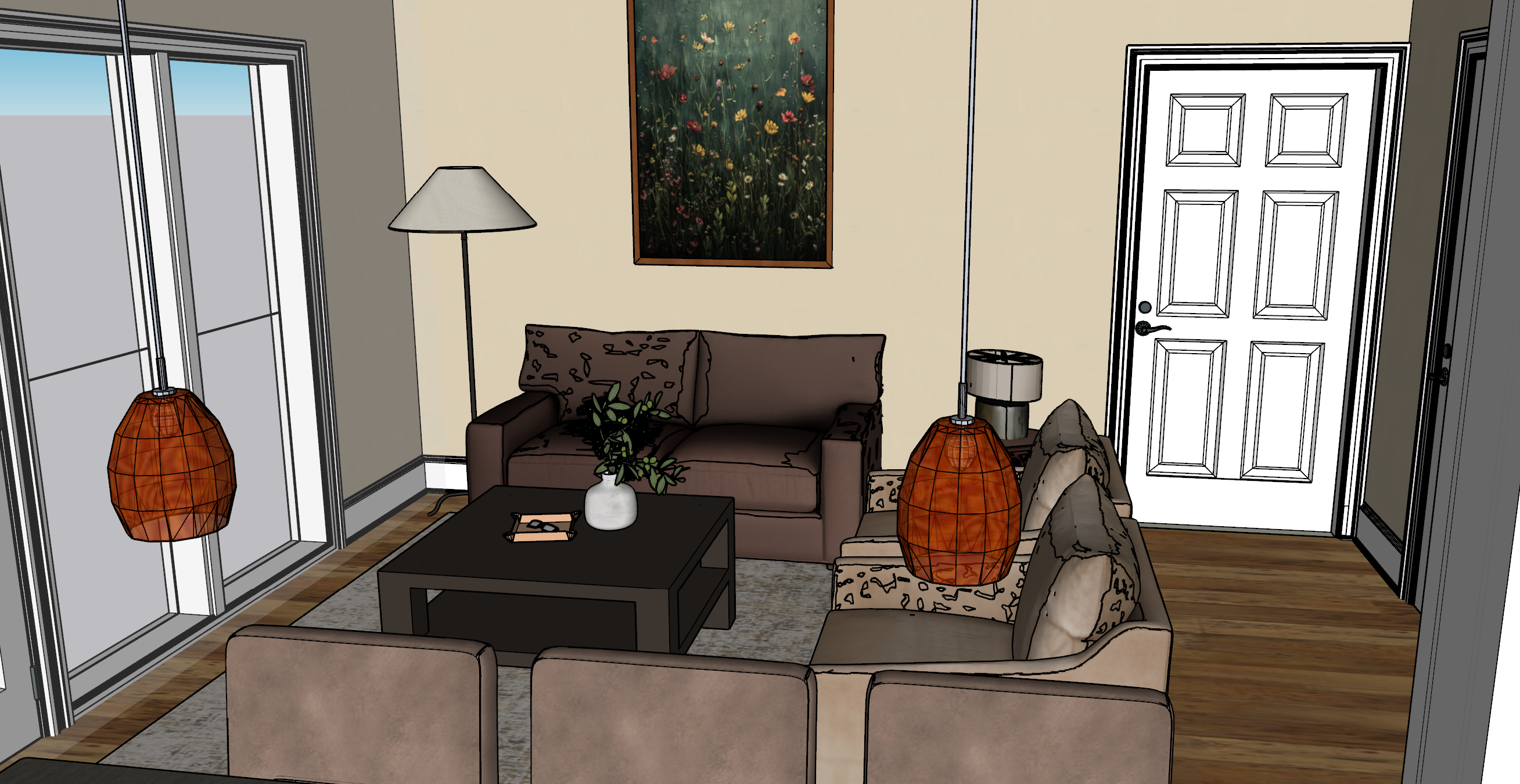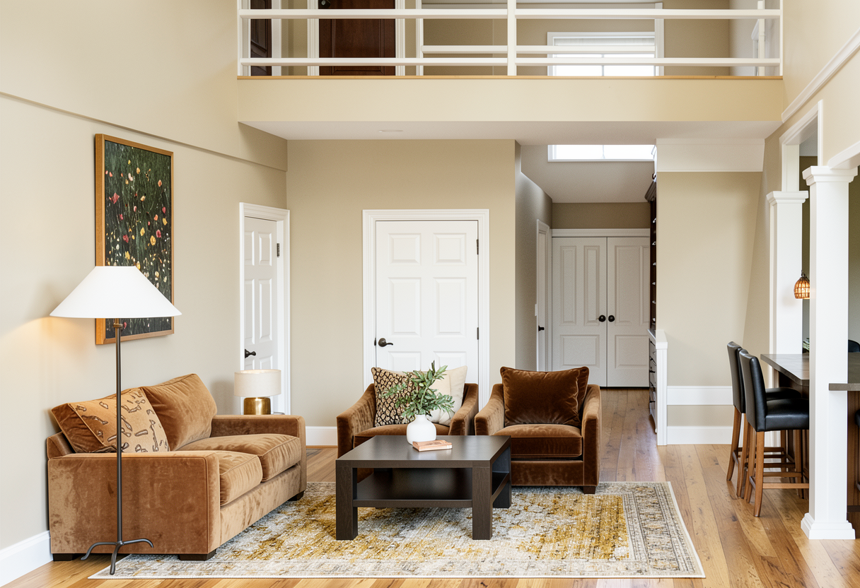 the doors and trim are white the floor is a natural oak hardwood the chairs are a camel velvet color the sofa is a pinecone color the bar stools are black leather with wood legs the walls are a wheat beige color the rug is a beige and subtle gold and taupe distressed rug the ourside environment is a deck with the bay in the background
