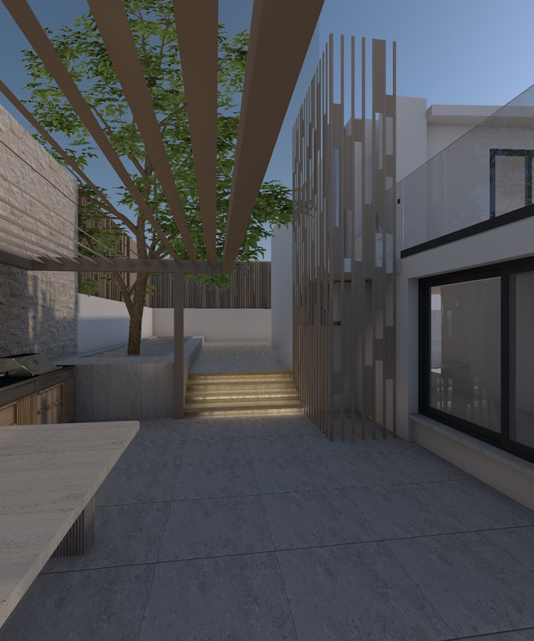 a calm and atmospheric architectural scene with a soft refined ambiance a modern outdoor courtyard with a calm refined and minimalist atmosphere designed with clean architectural lines and natural materials the space features large format stone flooring in light grey tones with a subtle textured finish on the left side there is a built in outdoor kitchen clad in natural stone combined with light wood cabinetry and a smooth stone countertop creating a balanced mix of raw and warm materials above a pergola structure with linear wooden beams extends the space casting soft directional shadows that enhance the depth and rhythm of the design at the center a slightly elevated platform with integrated steps leads to a higher level the steps include concealed warm led strip lighting producing a soft glow that emphasizes the geometry and adds a relaxing ambiance on the right side a vertical architectural screen made of slim beige slats acts as a semi transparent divider allowing filtered views while maintaining privacy behind it a glass railing with a minimal dark frame defines the upper level the building walls are finished in warm white tones while the window frames are dark charcoal grey aluminum adding contrast and a contemporary edge through the windows soft interior curtains are visible diffusing the light a mature tree rises through the space surrounded by gravel and low landscaping bringing a natural element that softens the architectural composition in the background and along the perimeter there is dense greenery and trees enhancing the connection to nature lighting should be soft natural and slightly warm ideally during golden hour or early evening with gentle shadows and a serene inviting atmosphere keywords modern courtyard minimal architecture warm lighting beige tones wood pergola architectural slats soft shadows greenery luxury outdoor space calm atmosphere the window down has frames are in dark charcoal grey aluminum with a matte finish providing a strong contrast against the lighter wall tones sheer curtains are visible from the interior softly diffusing the light and enhancing the sense of calmness above the window there is glass panels are installed contributing to a modern architectural with clear glass lighting should be soft and natural preferably during late afternoon or early evening with warm light tones enhancing the beige and warm white palette the overall mood should feel serene minimal and elegant with a strong connection between interior and exterior keep the geometry as it is