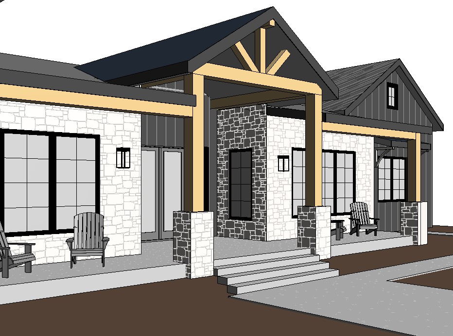 a modern farmhouse with green rolling hills and a few oak trees in the background black windows tan stacked limestone siding and post bases stained light brown cedar accents black fascia and shiplap siding black standing seam metal accents dark gray asphalt shingle roofing layered california native planting time of day is afternoon
