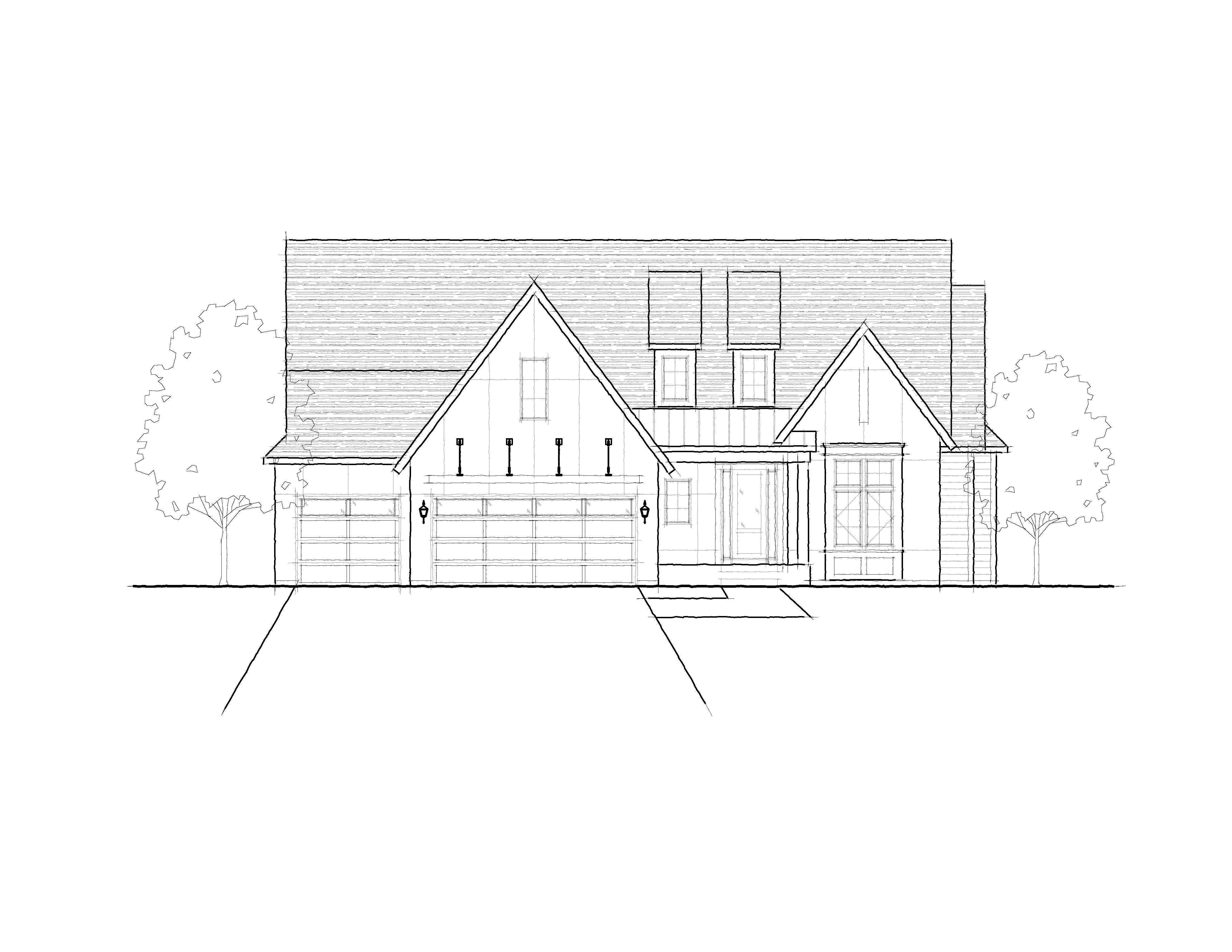 convert this black and white 2d architectural elevation drawing into a photorealistic rendering use the style and atmosphere of a modern farmhouse apply smooth dark charcoal black panel and channel siding instead of board and batten roof should be medium dark gray asphalt shingles garage doors window trim and front entry should be black for bold contrast show crisp bright sunlight with clear blue skies casting realistic shadows for a mid day feel windows should reflect daylight and hint at a bright airy interior add realistic landscaping with green grass small shrubs accent rocks and a small tree in front driveway should be dark asphalt final rendering should look natural and high quality like a professional real estate photo taken on a sunny day architecture