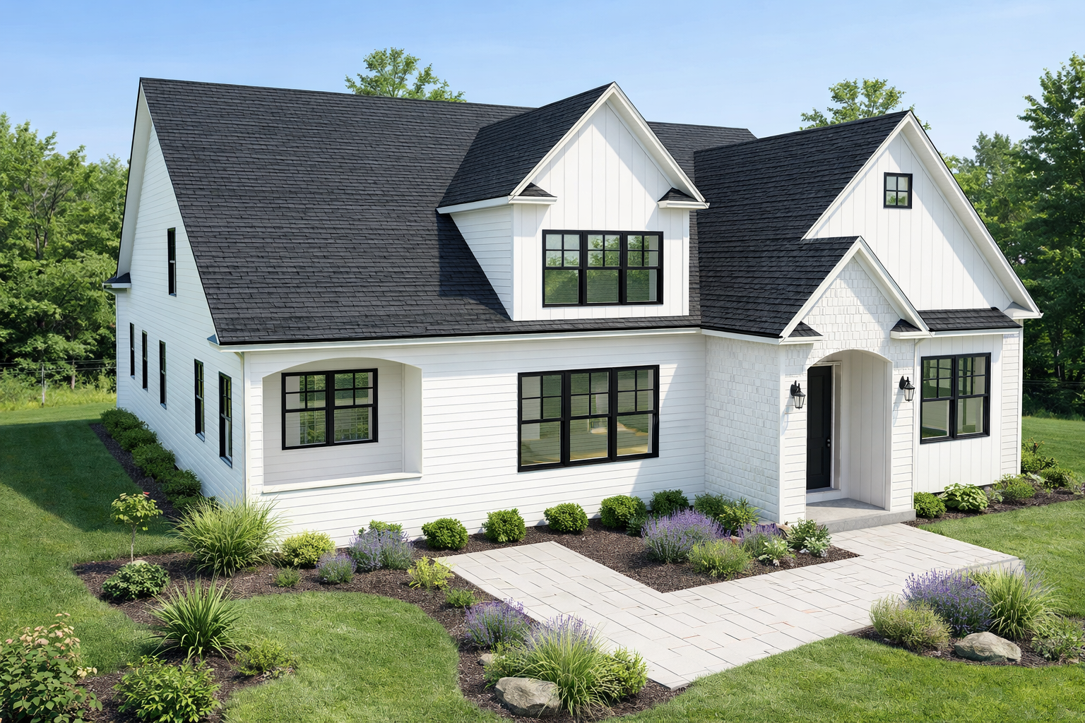 add patio walkway straight from entry door with landscaping on either side of walkway