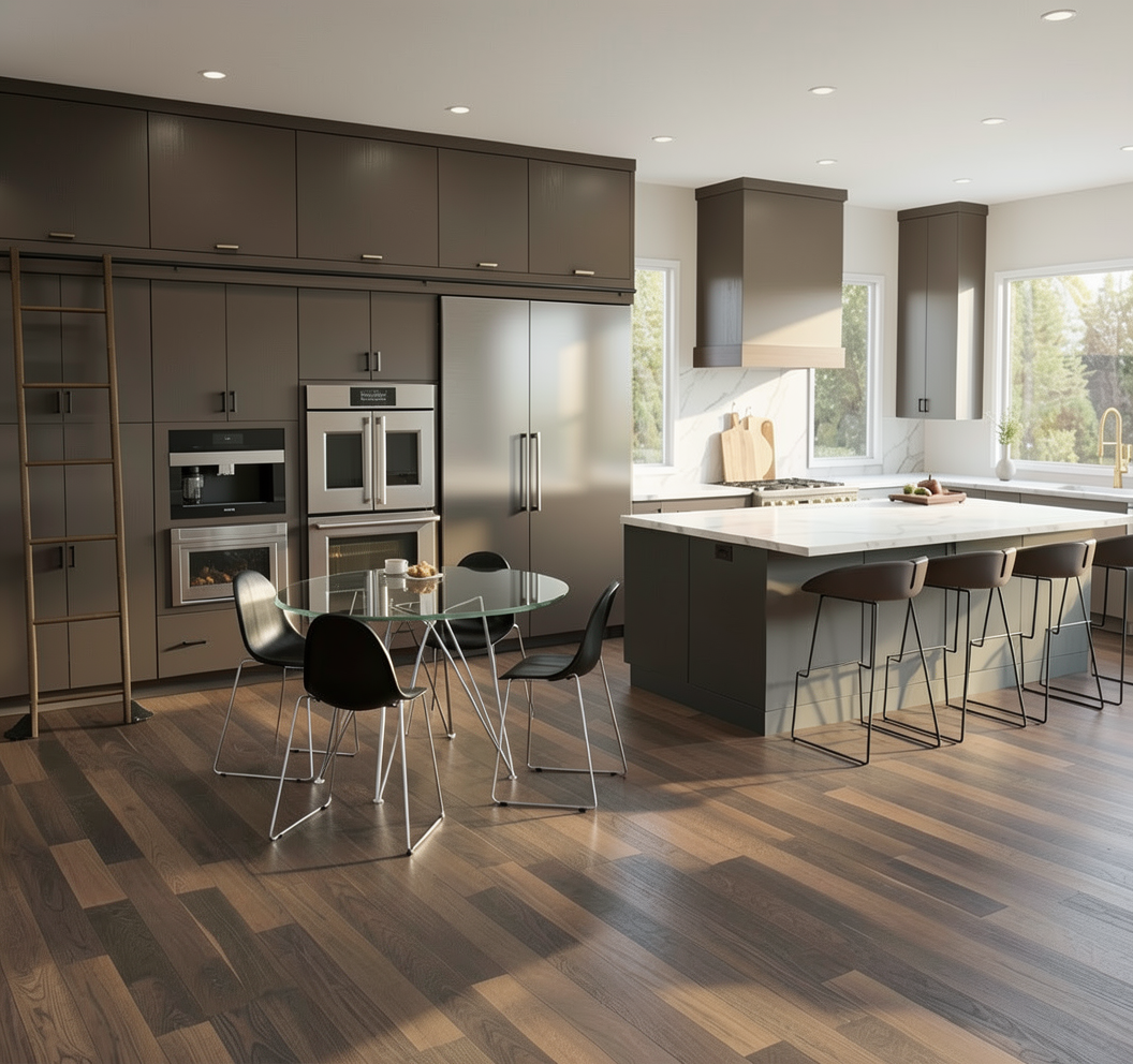 make library ladder look a bit more substantial make overall cabinet color look more like a soft warm beige and not so yellow
